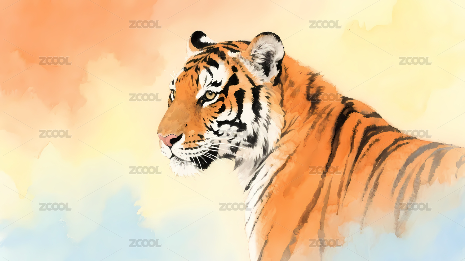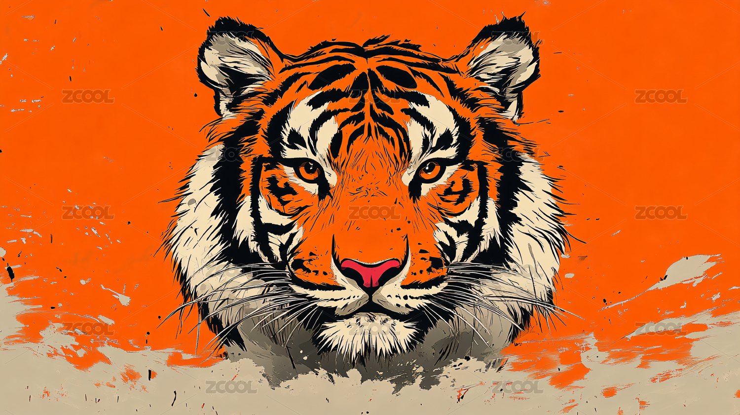 水墨,水墨风,国风,动物,老虎,虎,工笔画,中式,中国风,插画