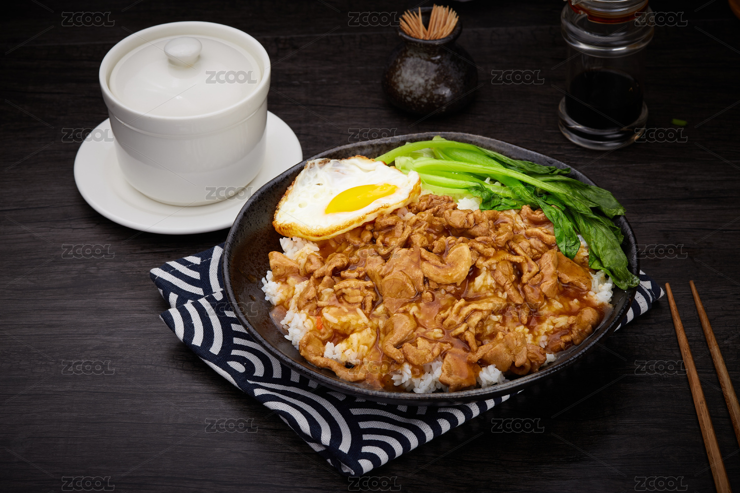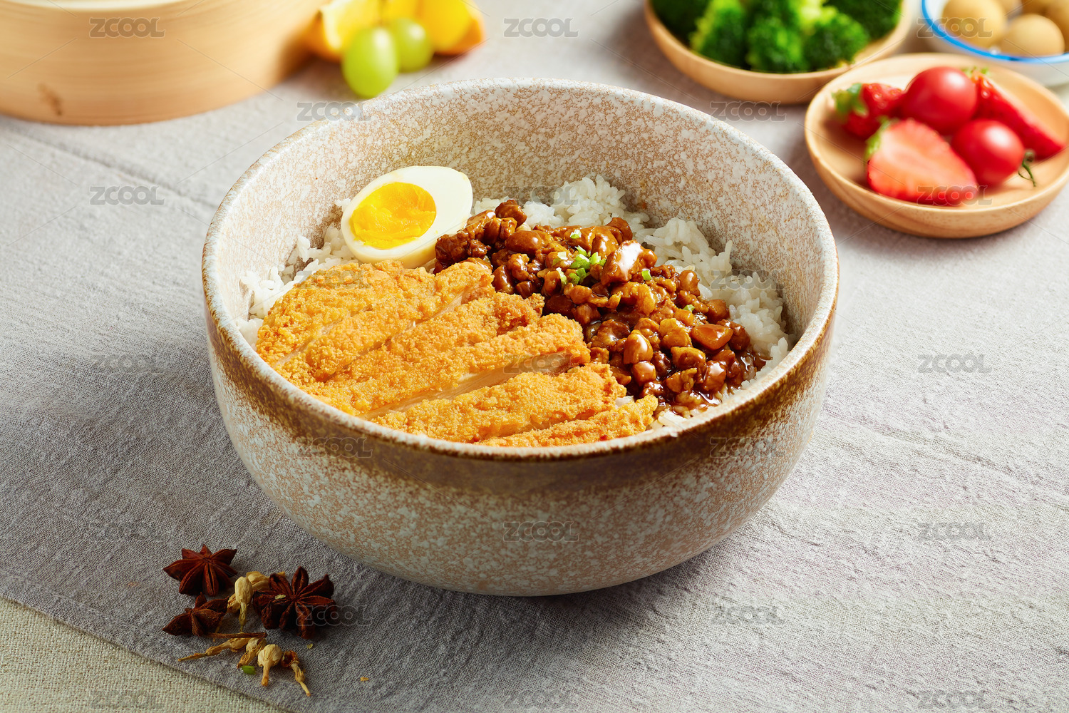 棕色木纹桌面上放着一碗砂锅炸鸡排拌饭