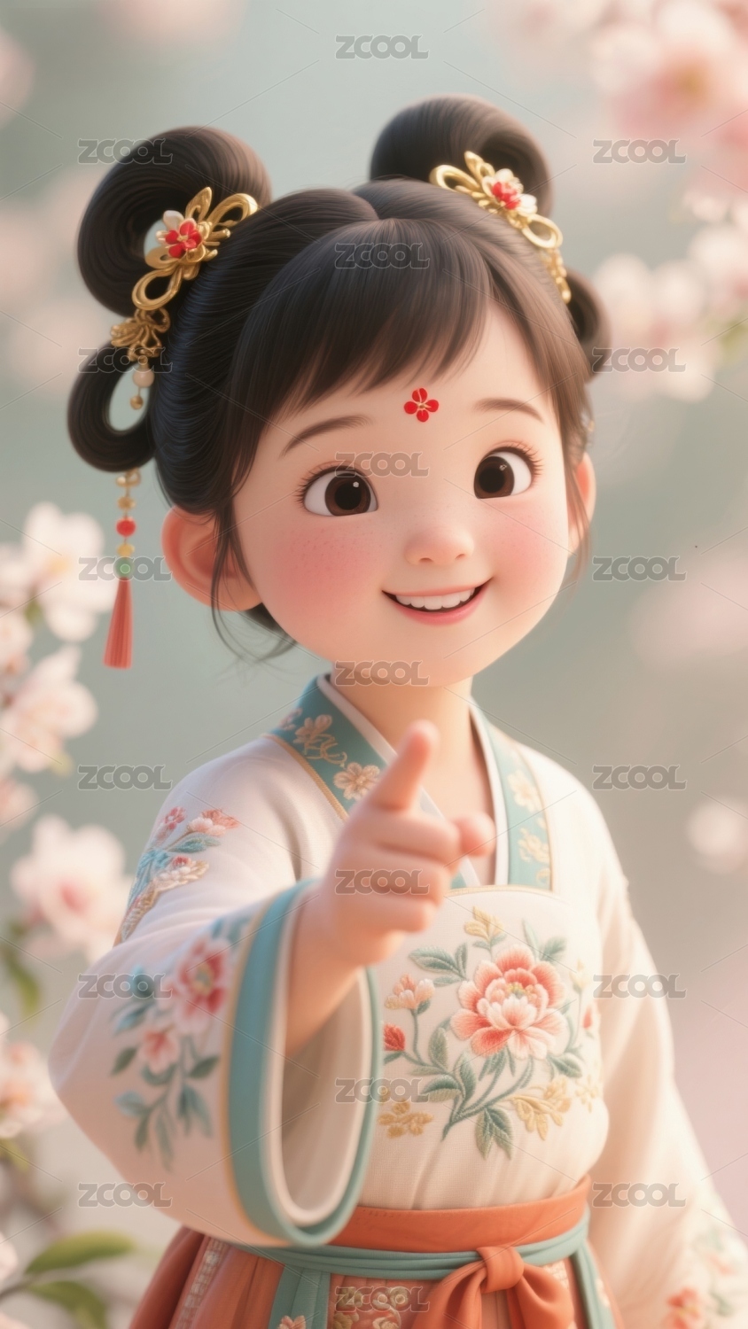穿汉服的少女手拿一个大月饼,3D人物插画