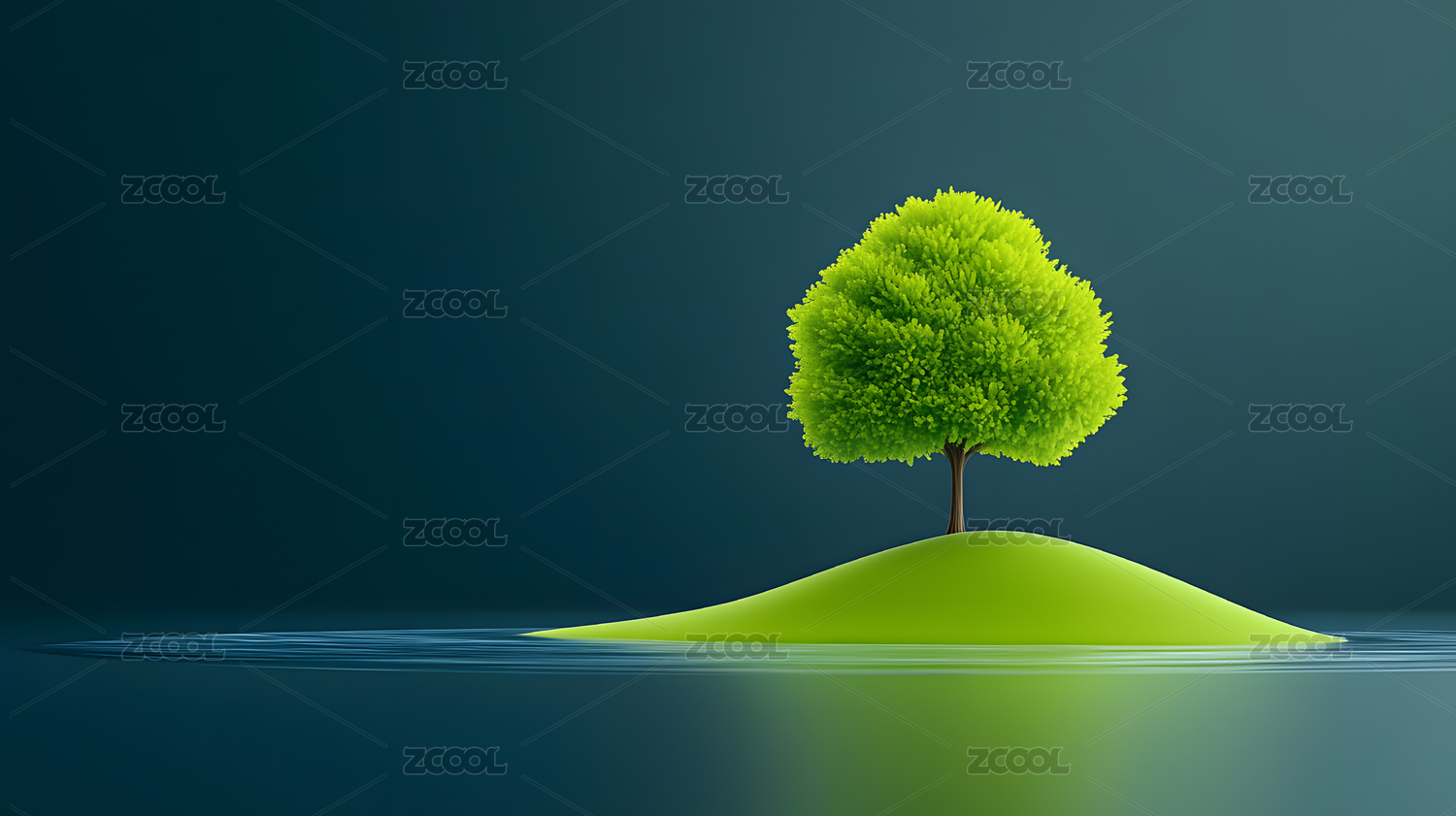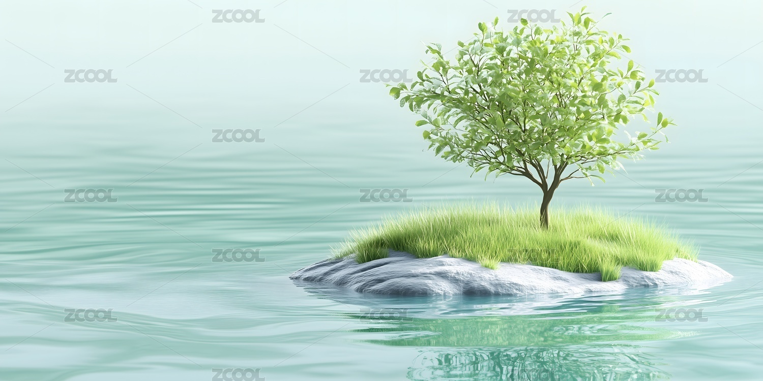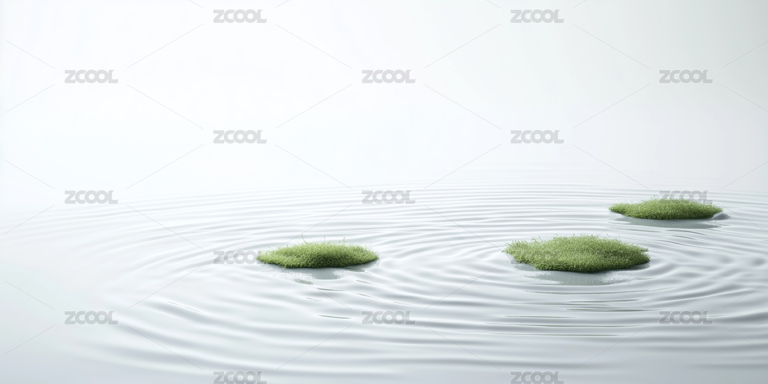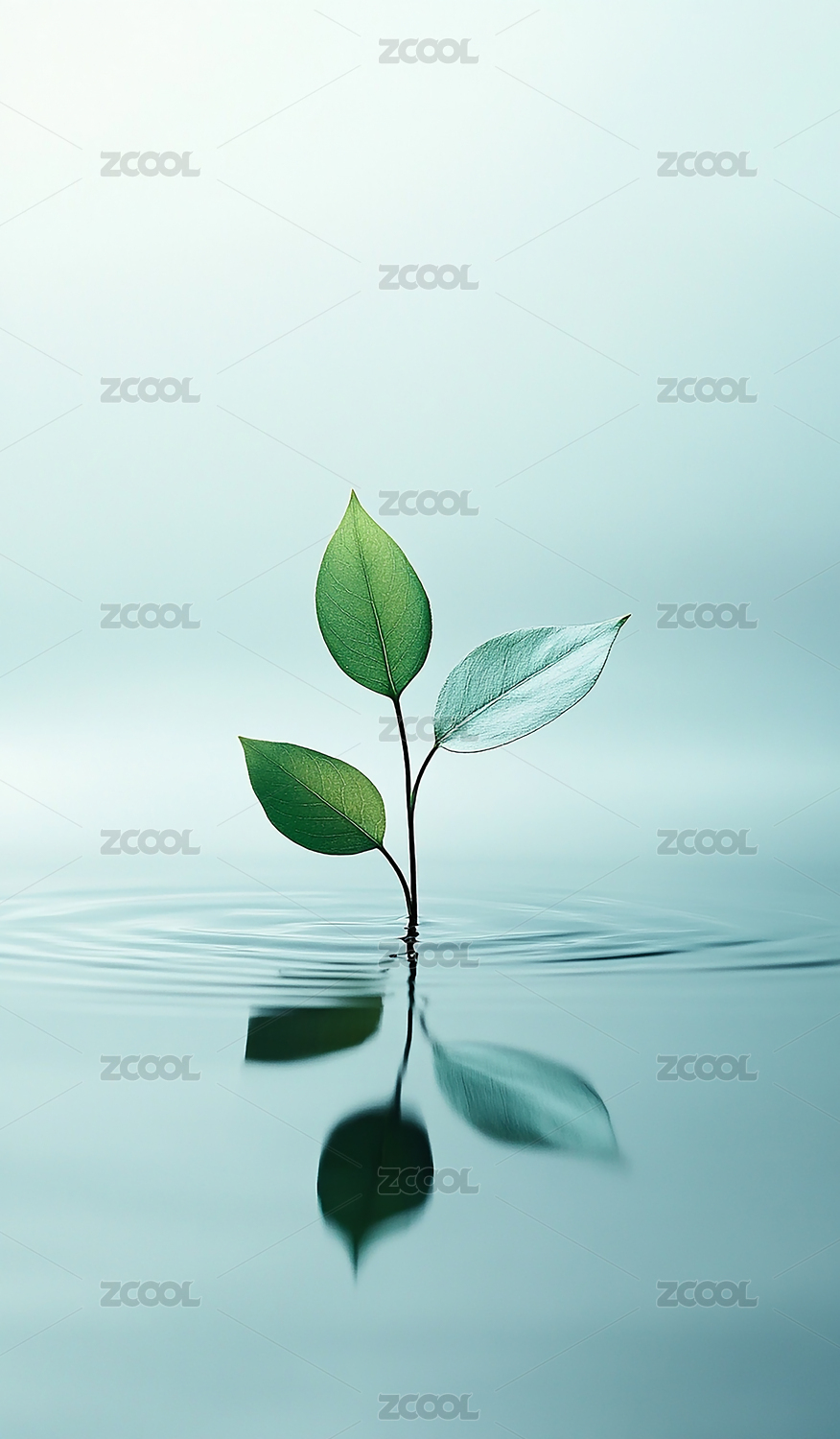 一株生机勃勃的植物矗立在水面上的绿色草地