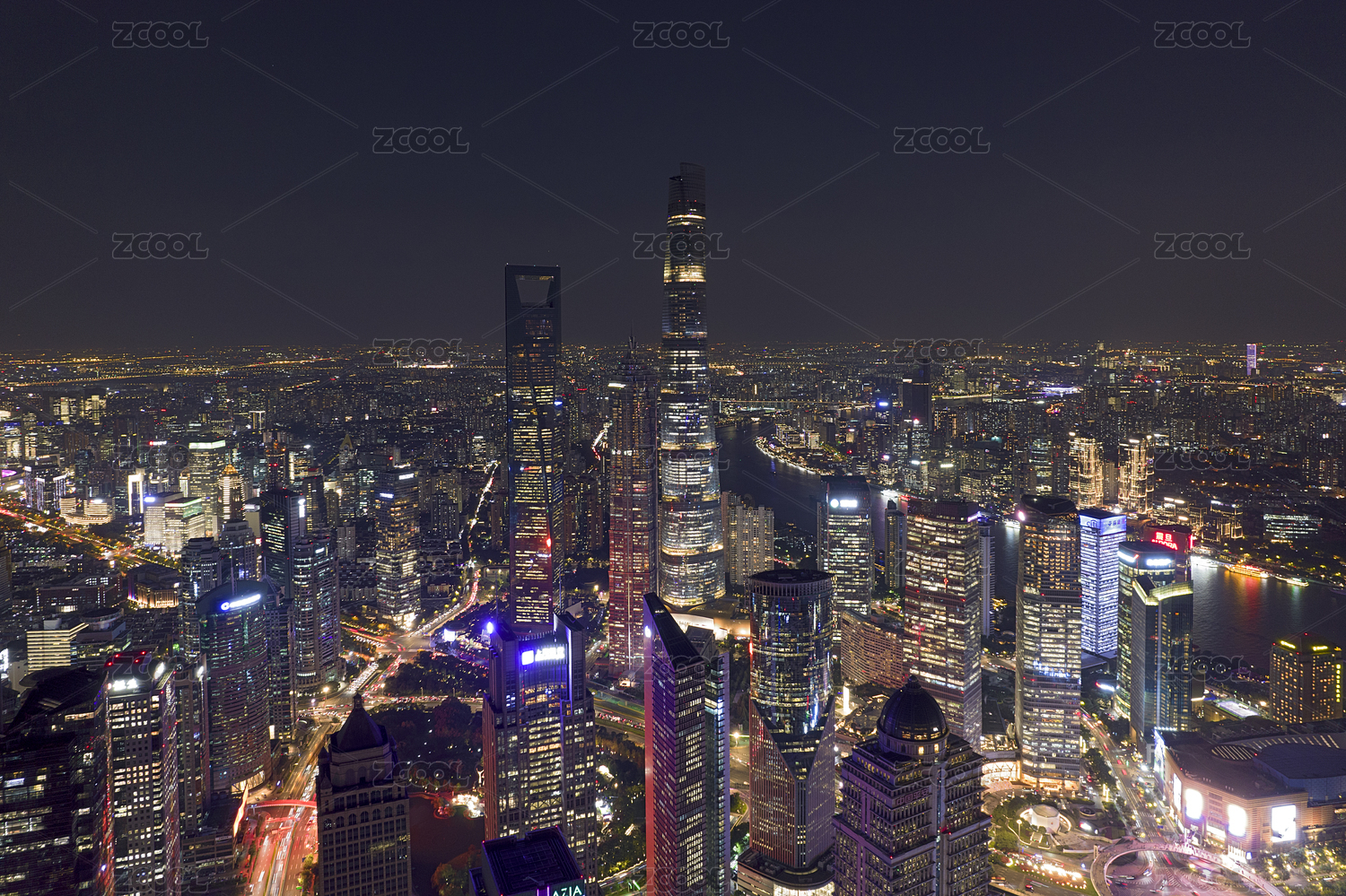 俯瞰航拍中国上海浦东陆家嘴CBD建筑夜景