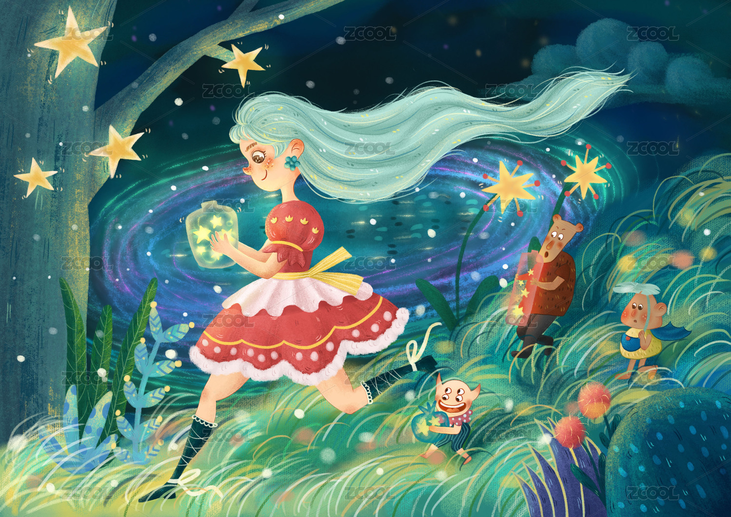 夏夜,森林,女孩,精灵,奇幻,插画,幻想,夜晚