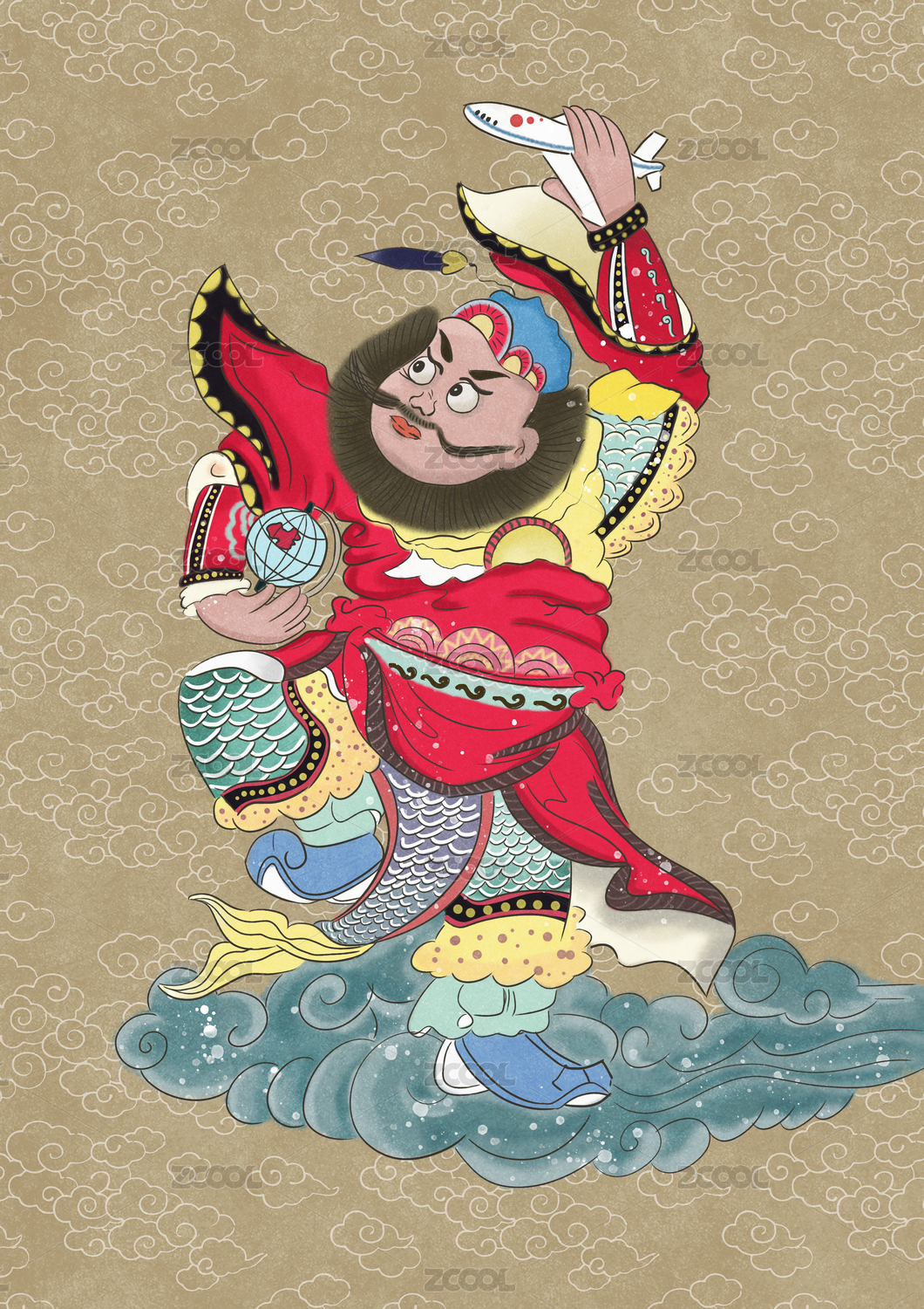 手里拿着幡和文书脚踩祥云的中国风传统门神