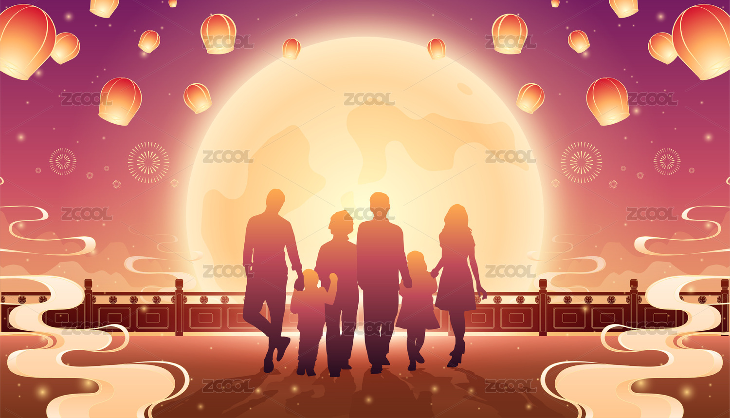 中秋佳节家人共聚一堂赏月拍月亮插画
