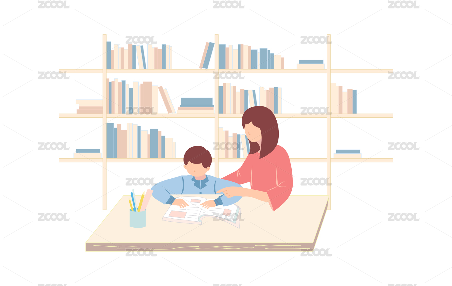 书架背景前,母亲教孩子阅读