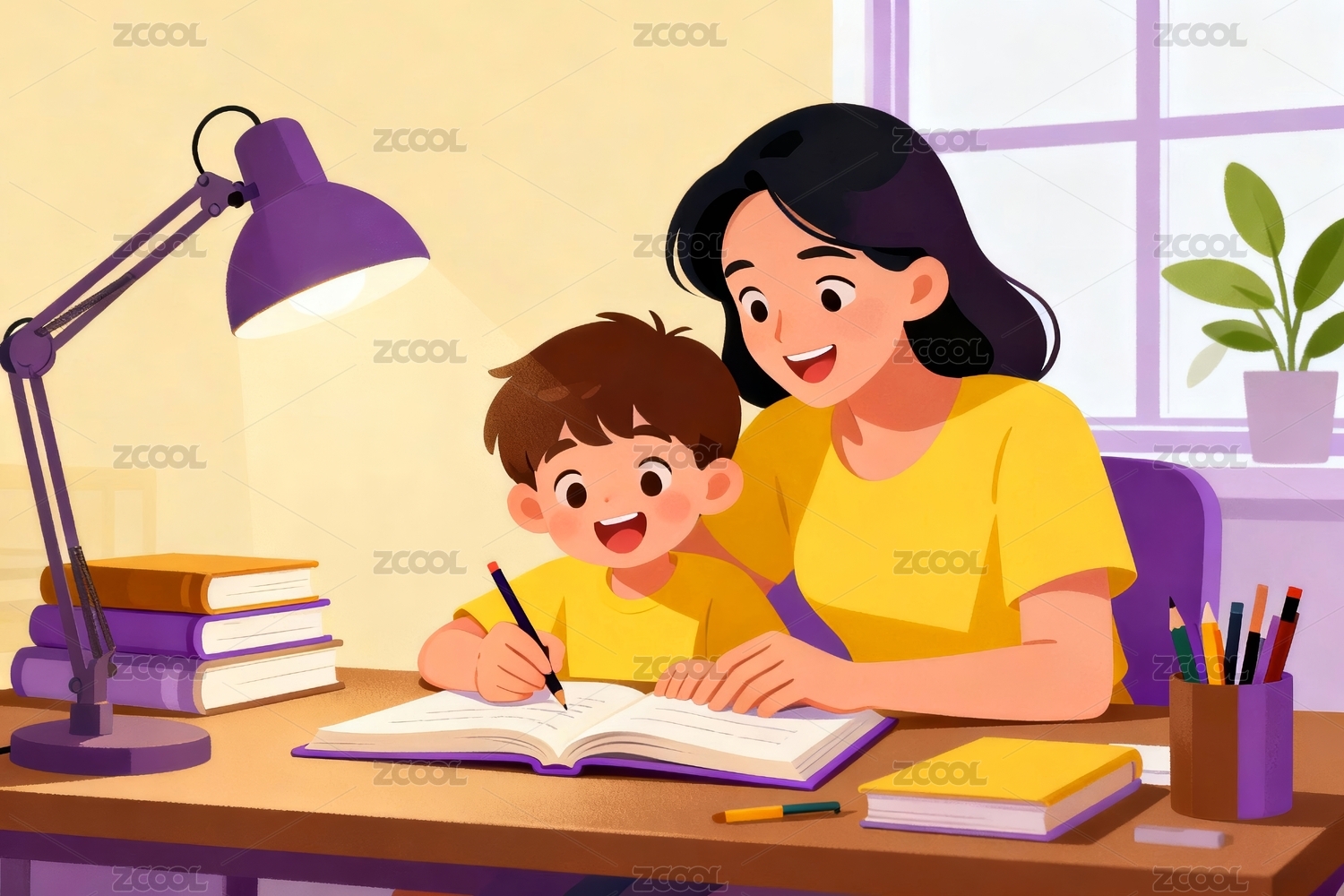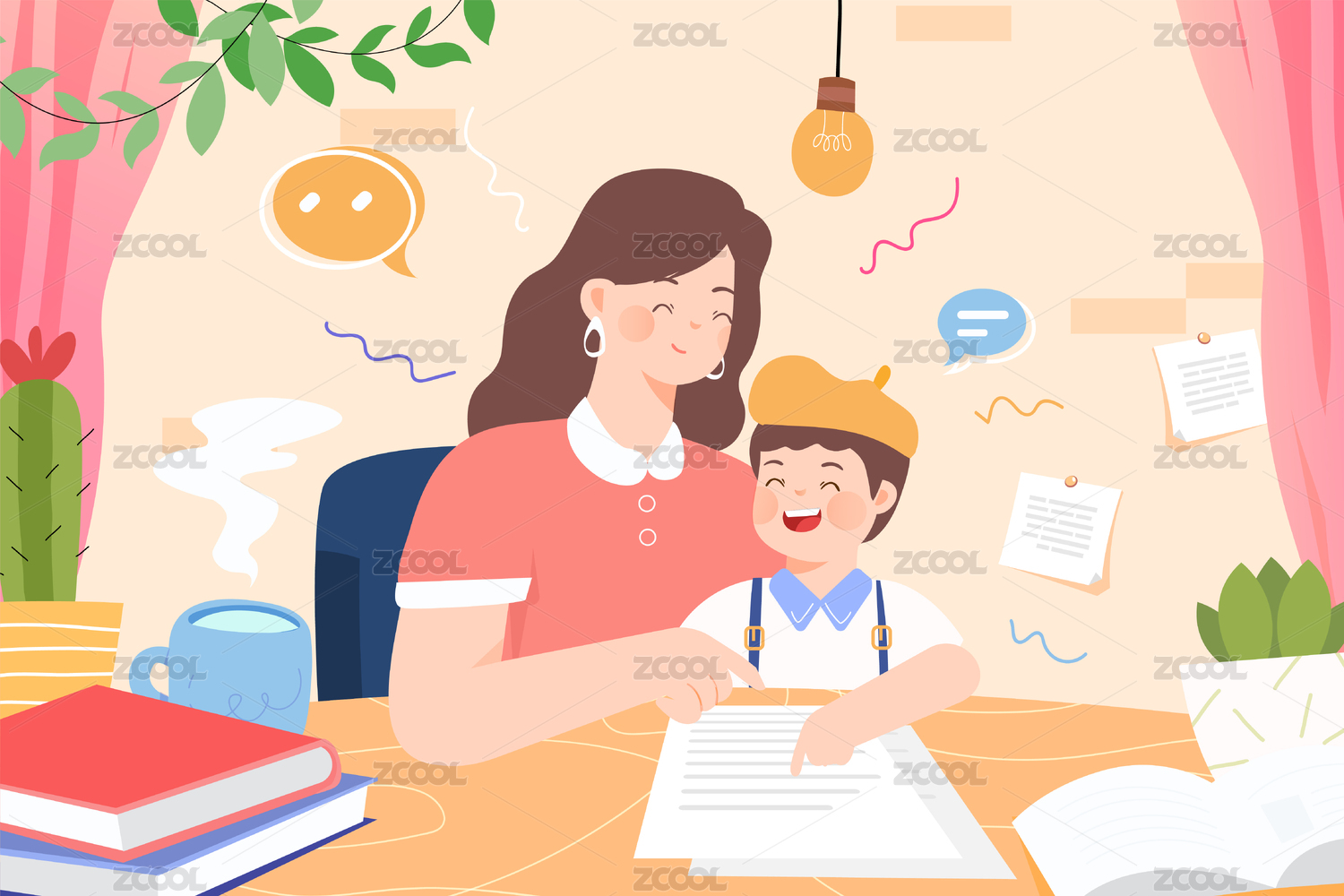 一个妈妈在给孩子辅导作业窗户书桌插画