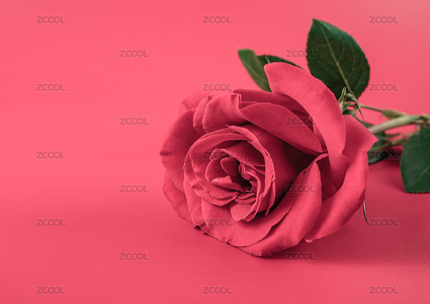 粉红色背景上一朵盛开沾满水珠的粉红玫瑰花