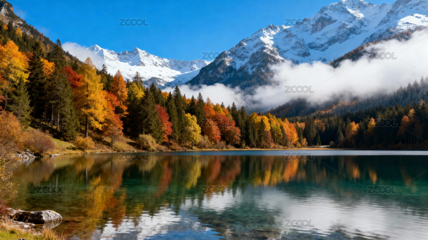 宁静祥和的湖光山色倒映着秋日的壮丽景色