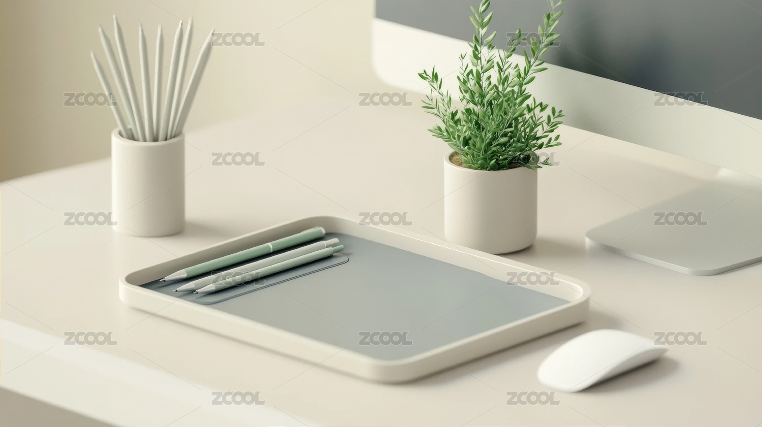实木桌面上的笔记本电脑计算器手机鼠标彩色铅笔