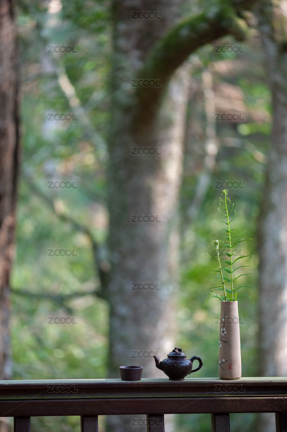 森林背景前的台面上放置的紫砂茶具和花瓶