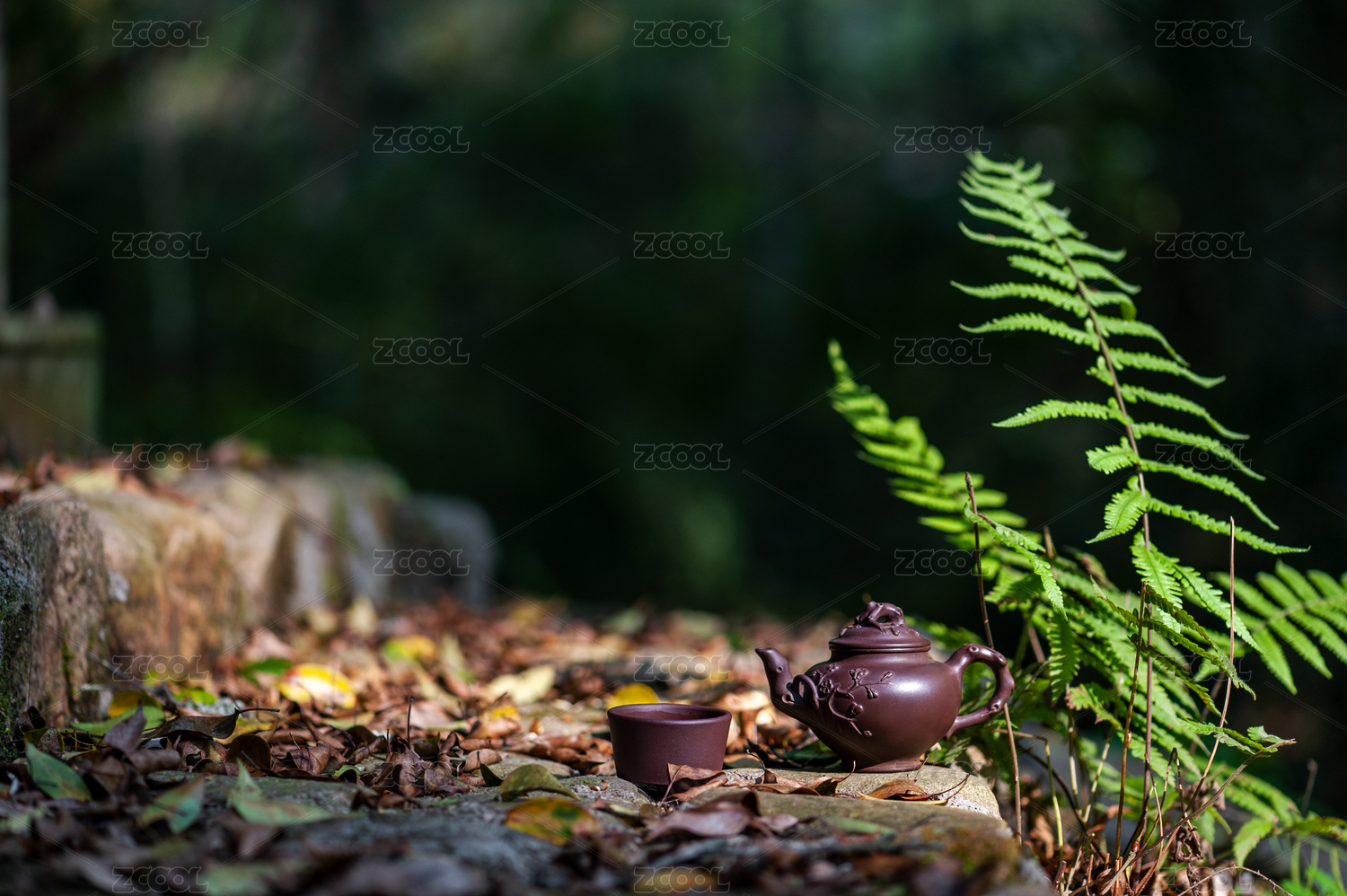 森林公园落叶的地板上放置的紫砂茶具和花瓶
