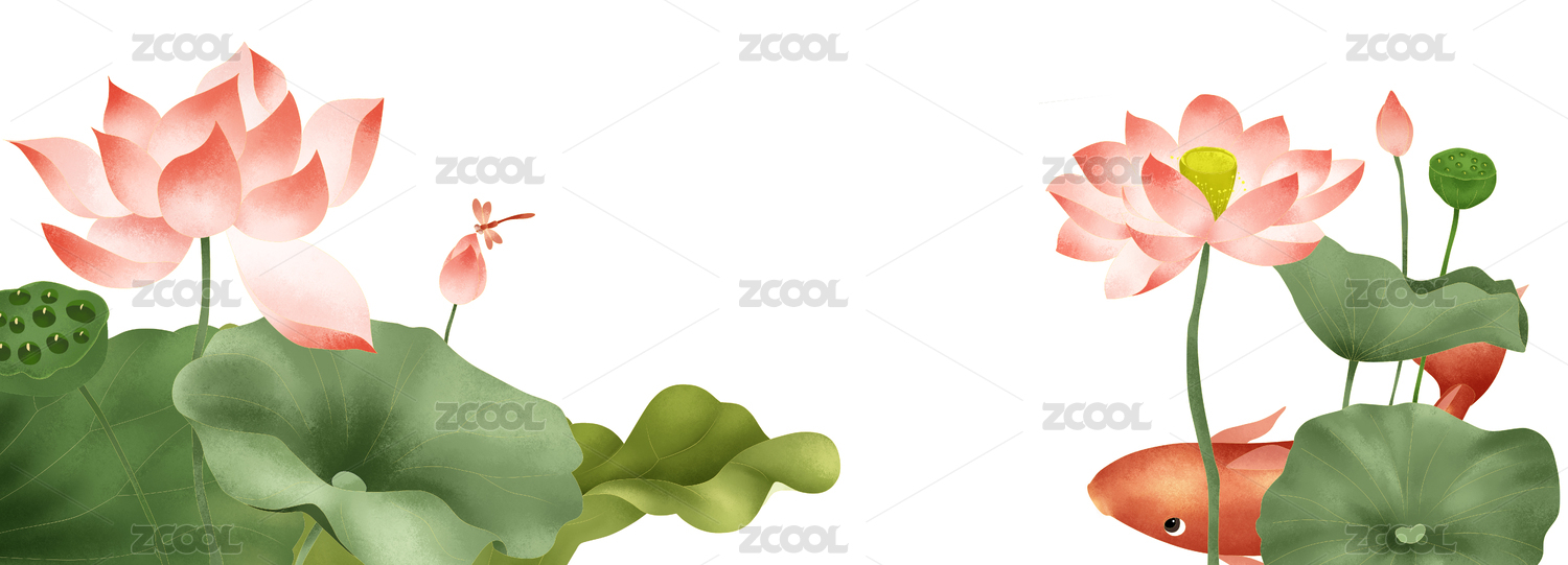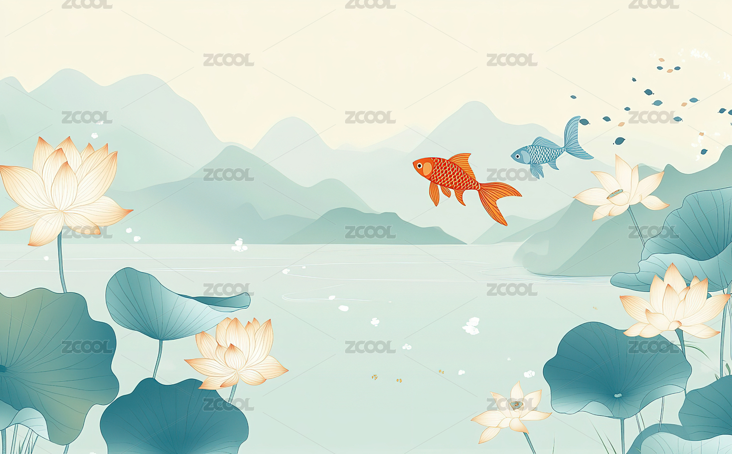 卡通夏天荷花池塘锦鲤中国风矢量插画素材