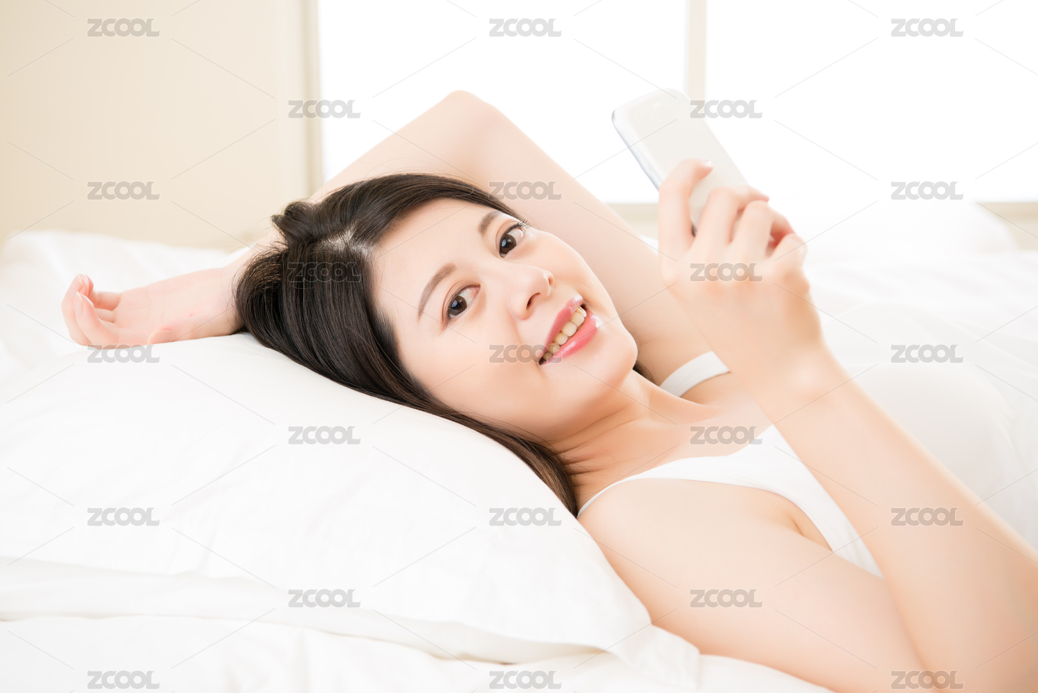 一名年轻的亚洲女子半躺在床上拿着手机自拍