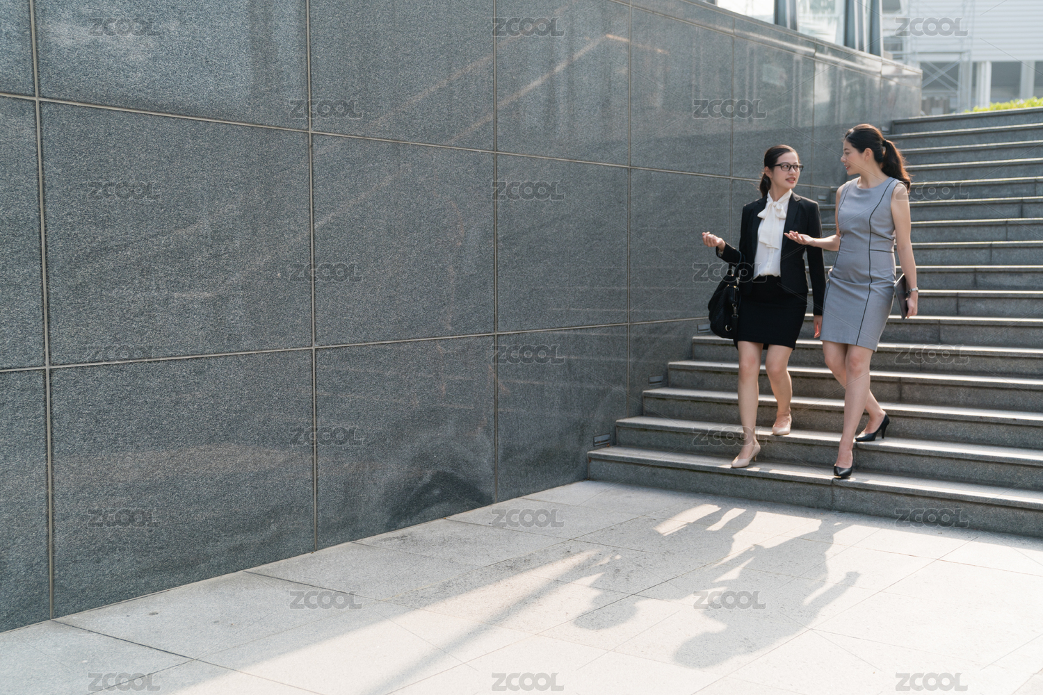 两个亚洲办公室小姐走上楼梯,相互讨论。上一回视图。他们都穿着高跟鞋和正装打扮背着书包。谈到商业的东西和的costumers。