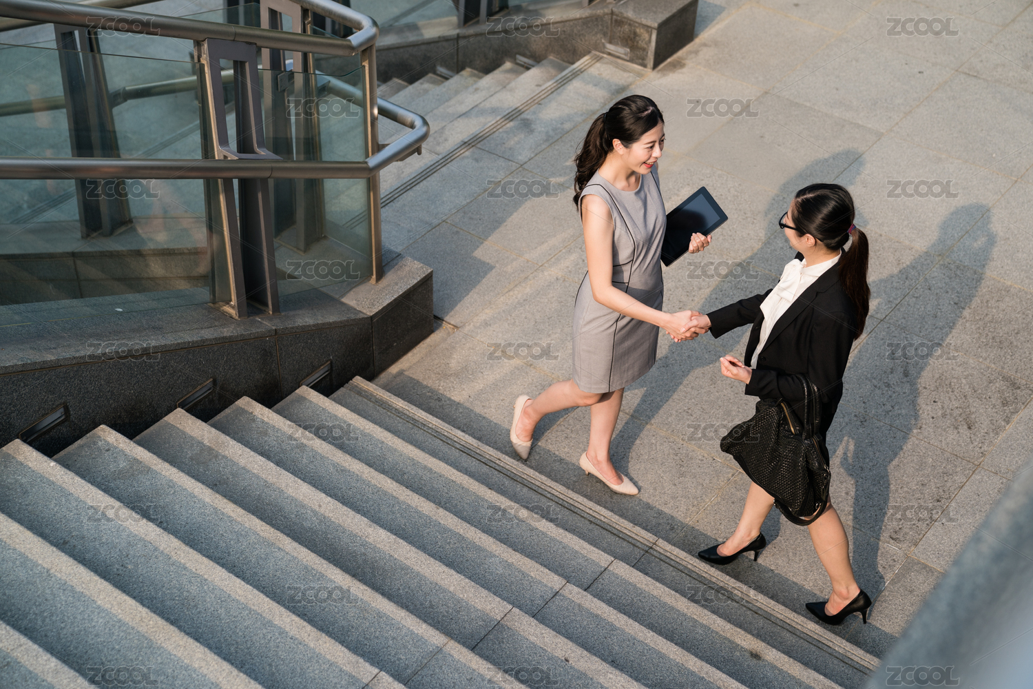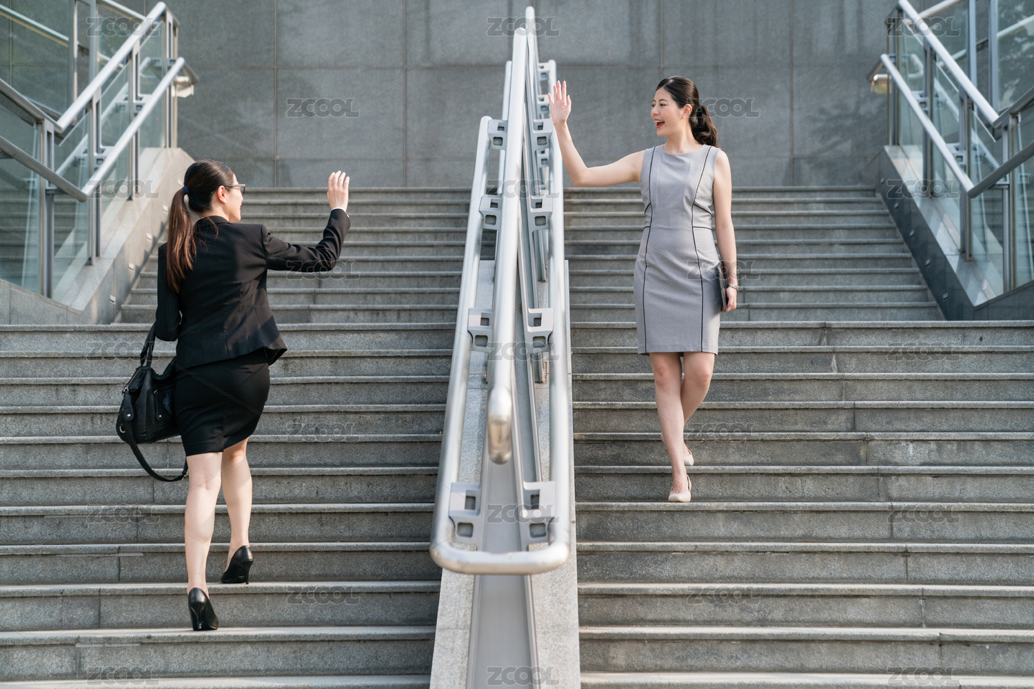 两个业务亚洲小姐挥舞自己的双手对方时,他们走在stairs.They都穿着大smile.On的侧视图。穿正装和裙子。