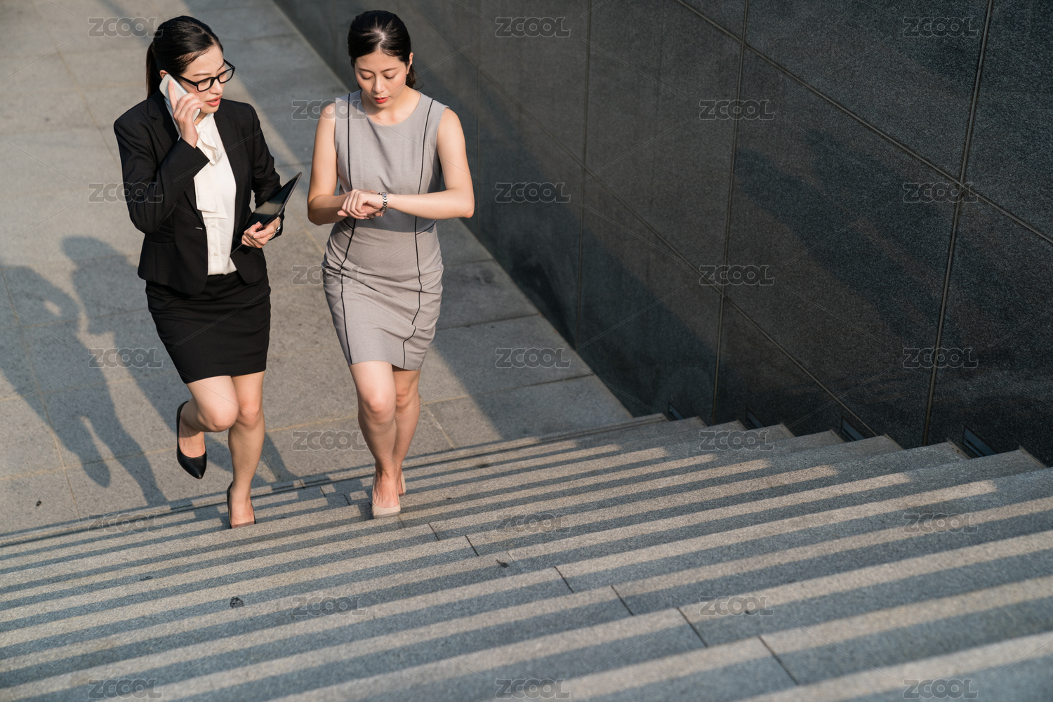 在两个业务亚洲小姐的步行上楼了上述观点。一个在手机上发言,一个盯着看手表上。他们要参加一个会议。