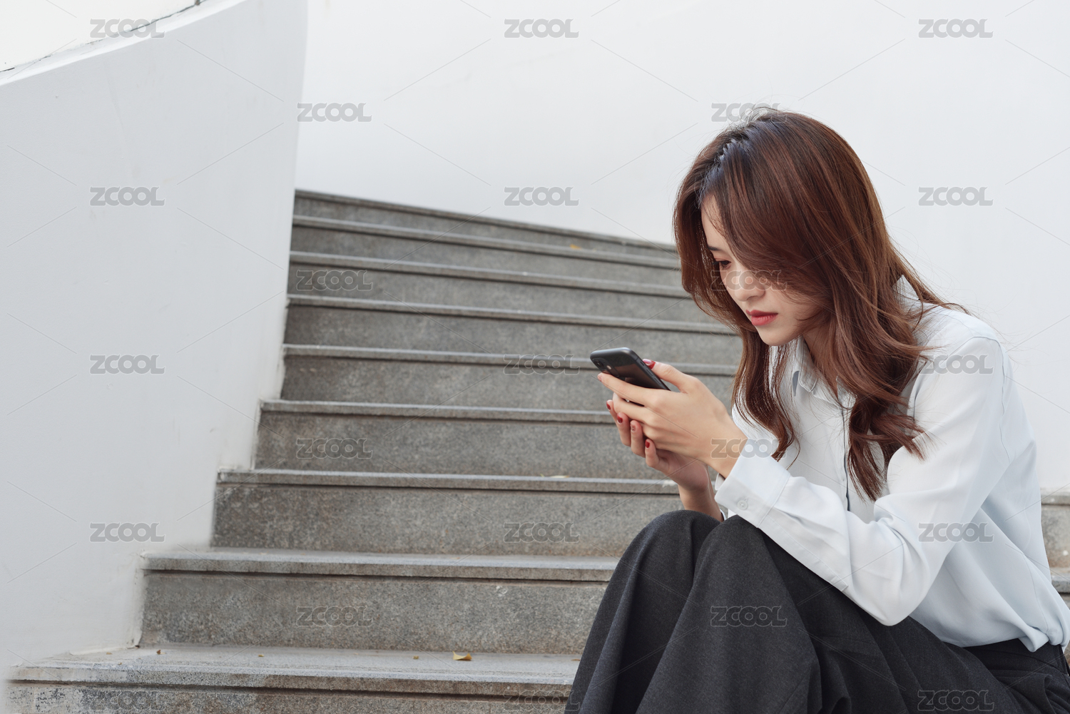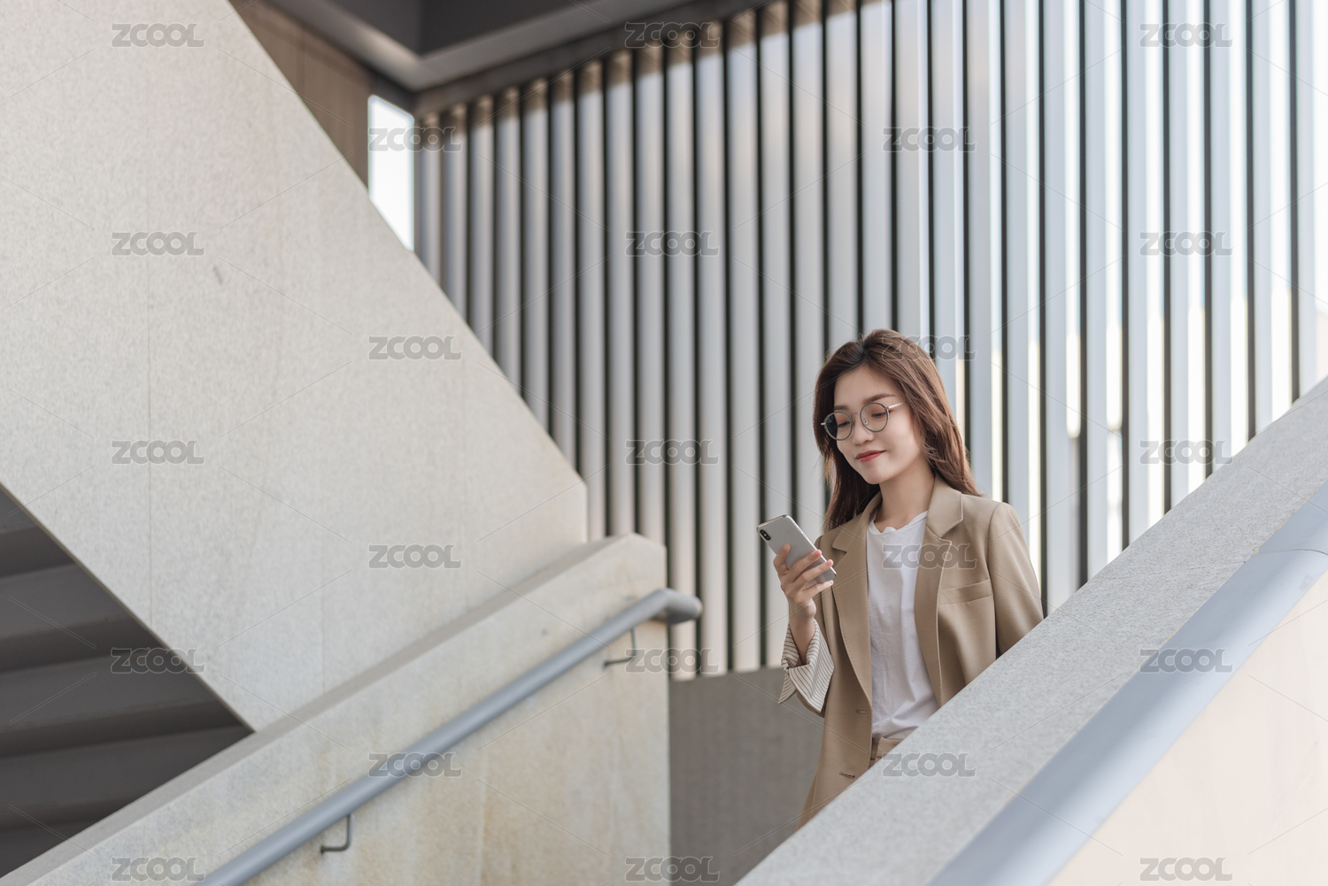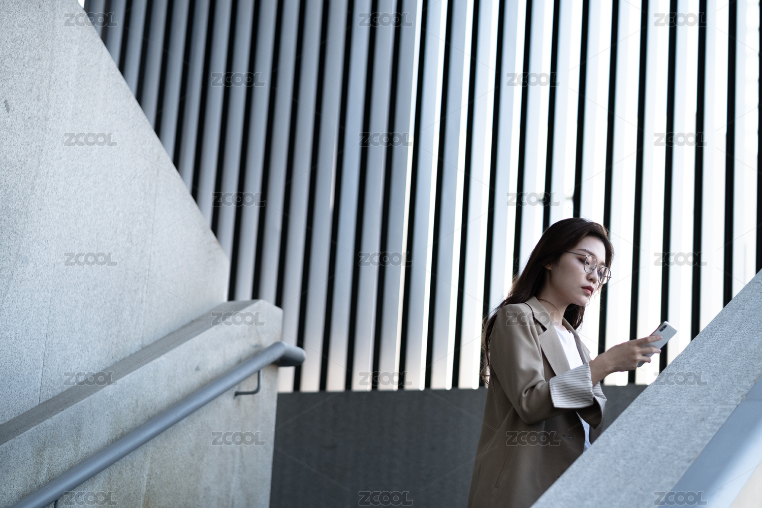 年轻时尚女士在楼梯上边看手机边下楼梯