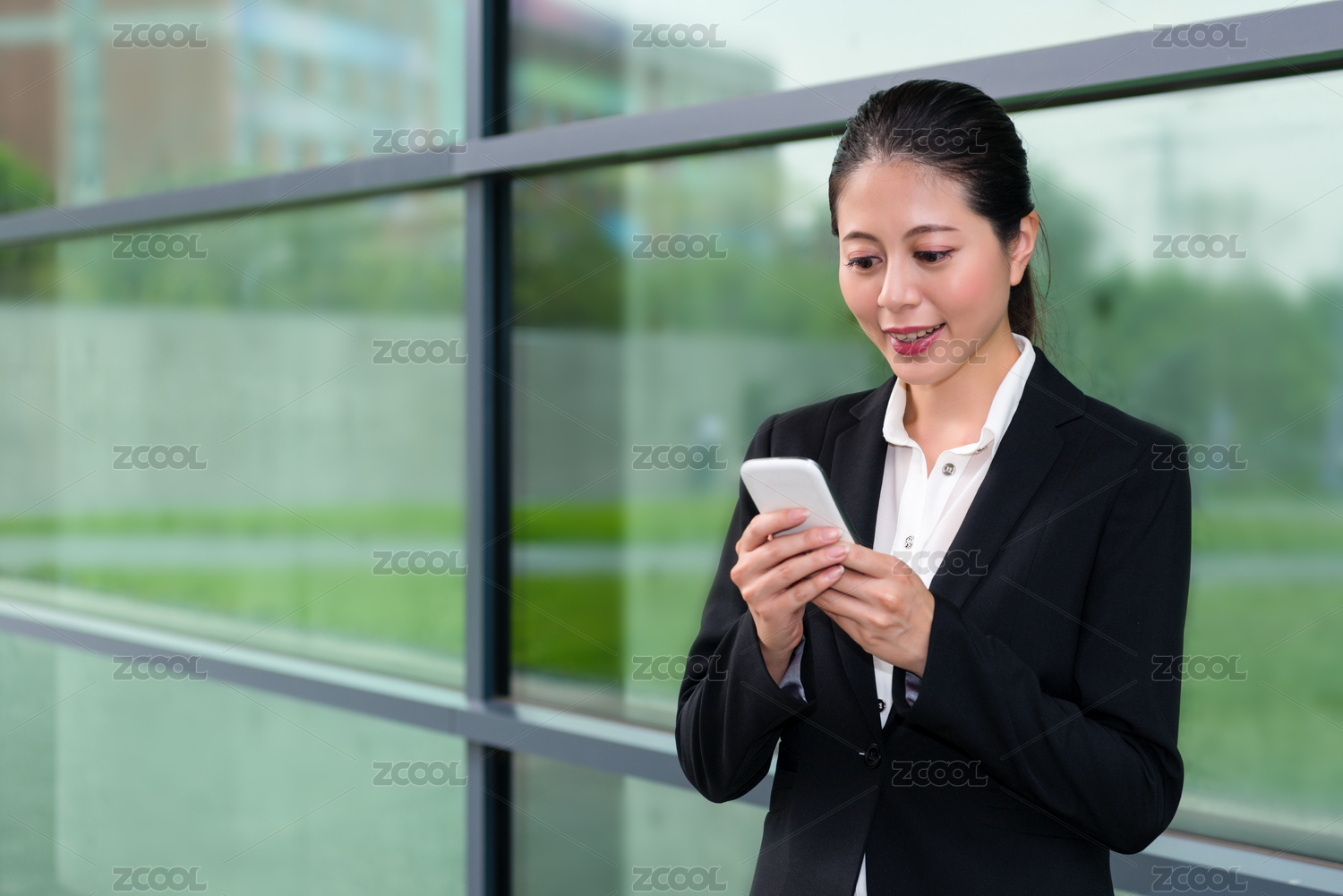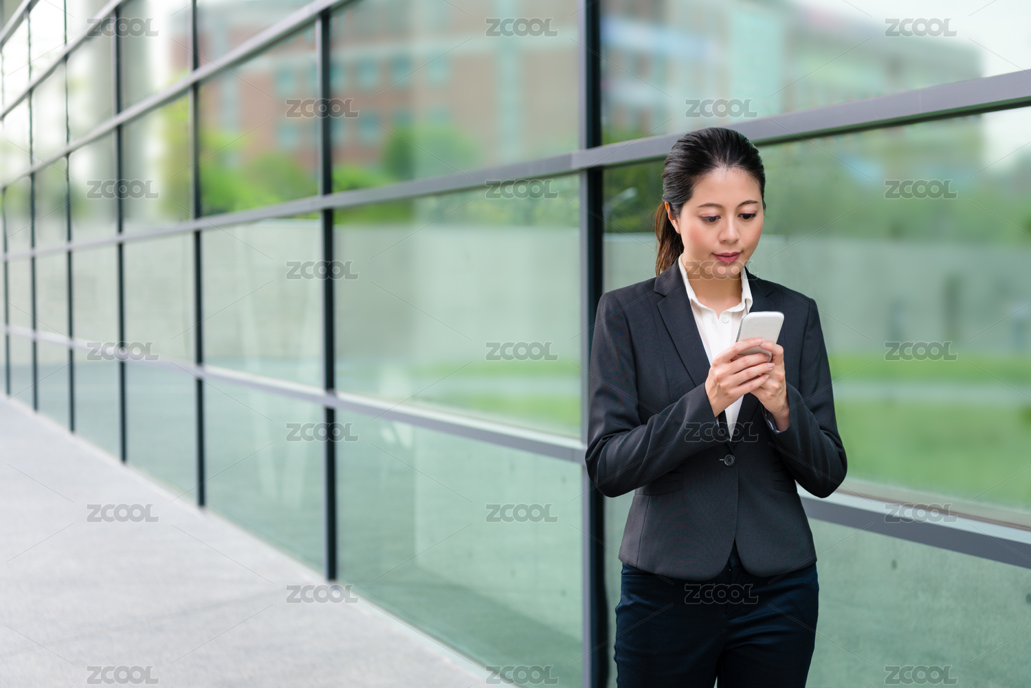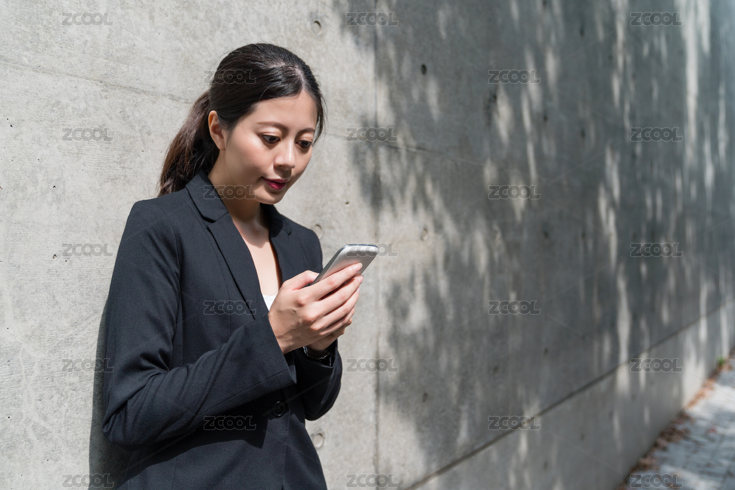 有吸引力的商业女人发短信消息发送给她的老板有一个友好的微笑黑色西装站在户外。
