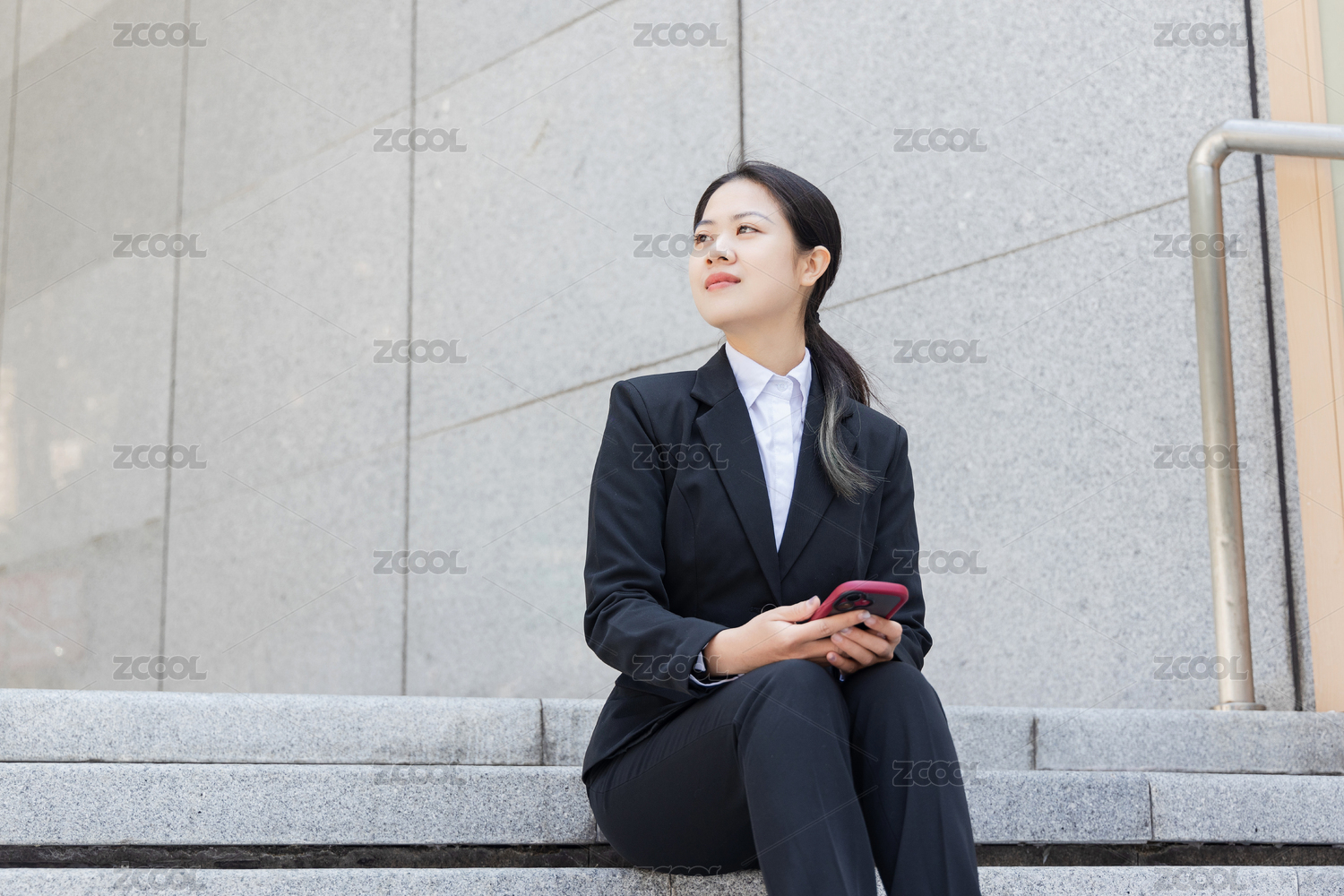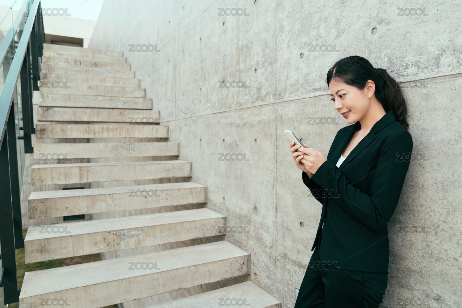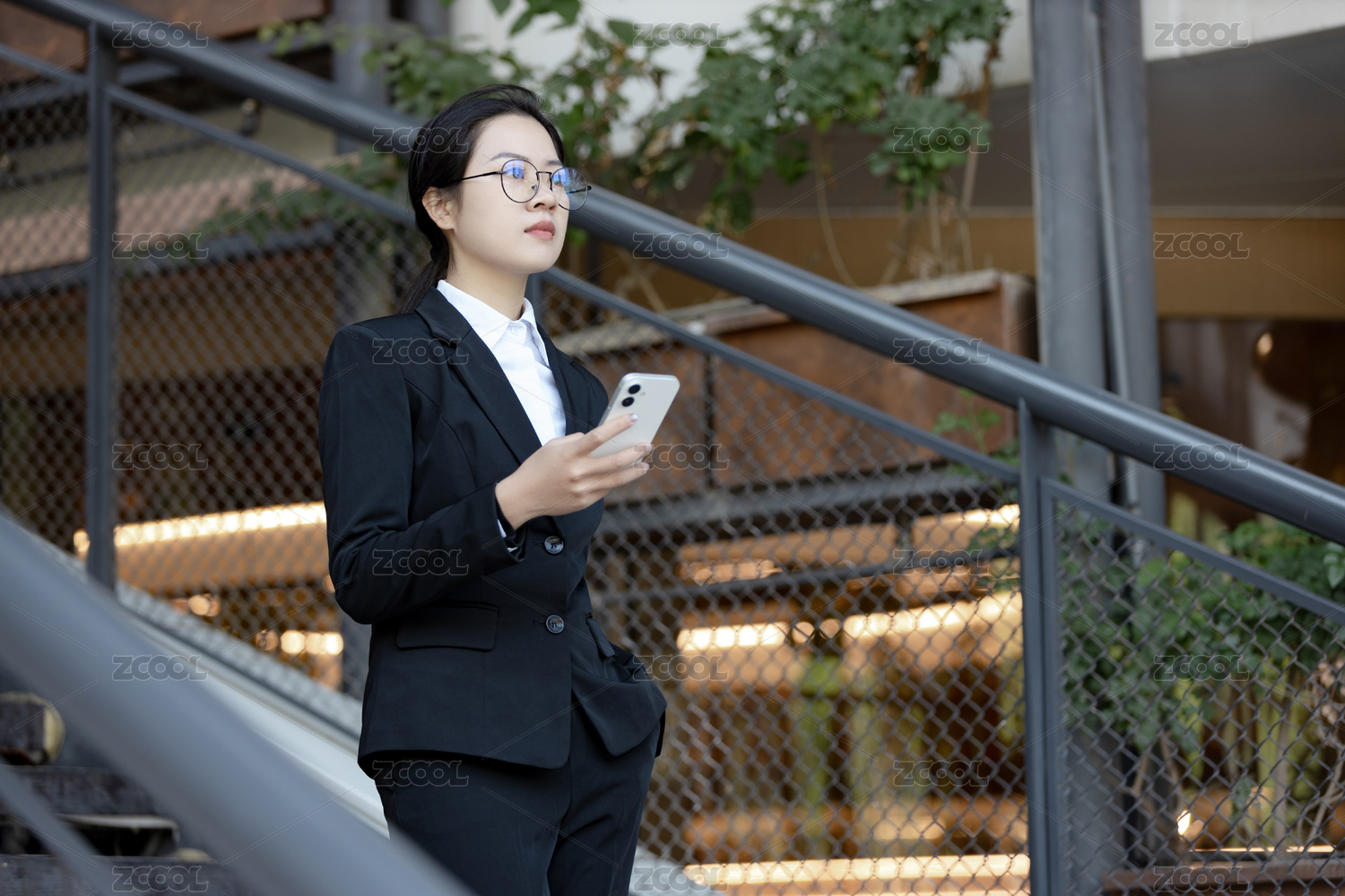 专业年轻的亚裔女子站在楼梯短信消息,她的客户在室外。
