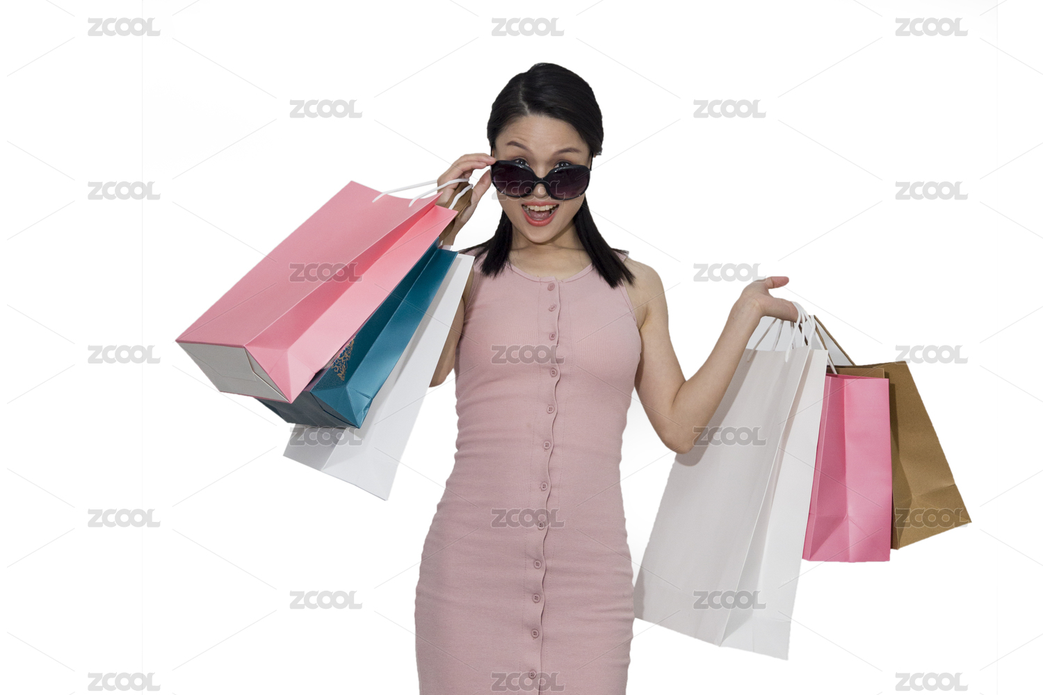 穿着黄色连衣裙拿着购物袋的美丽女性