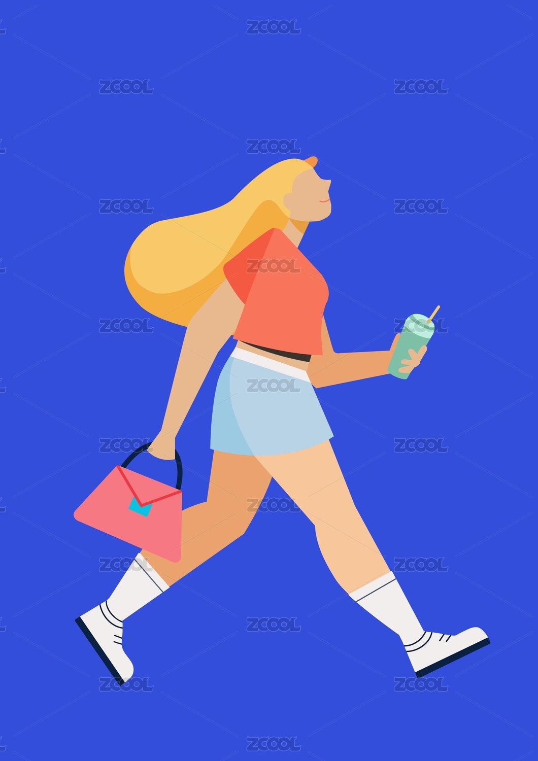 走路拿着咖啡奶茶饮料穿短裙的长发女人