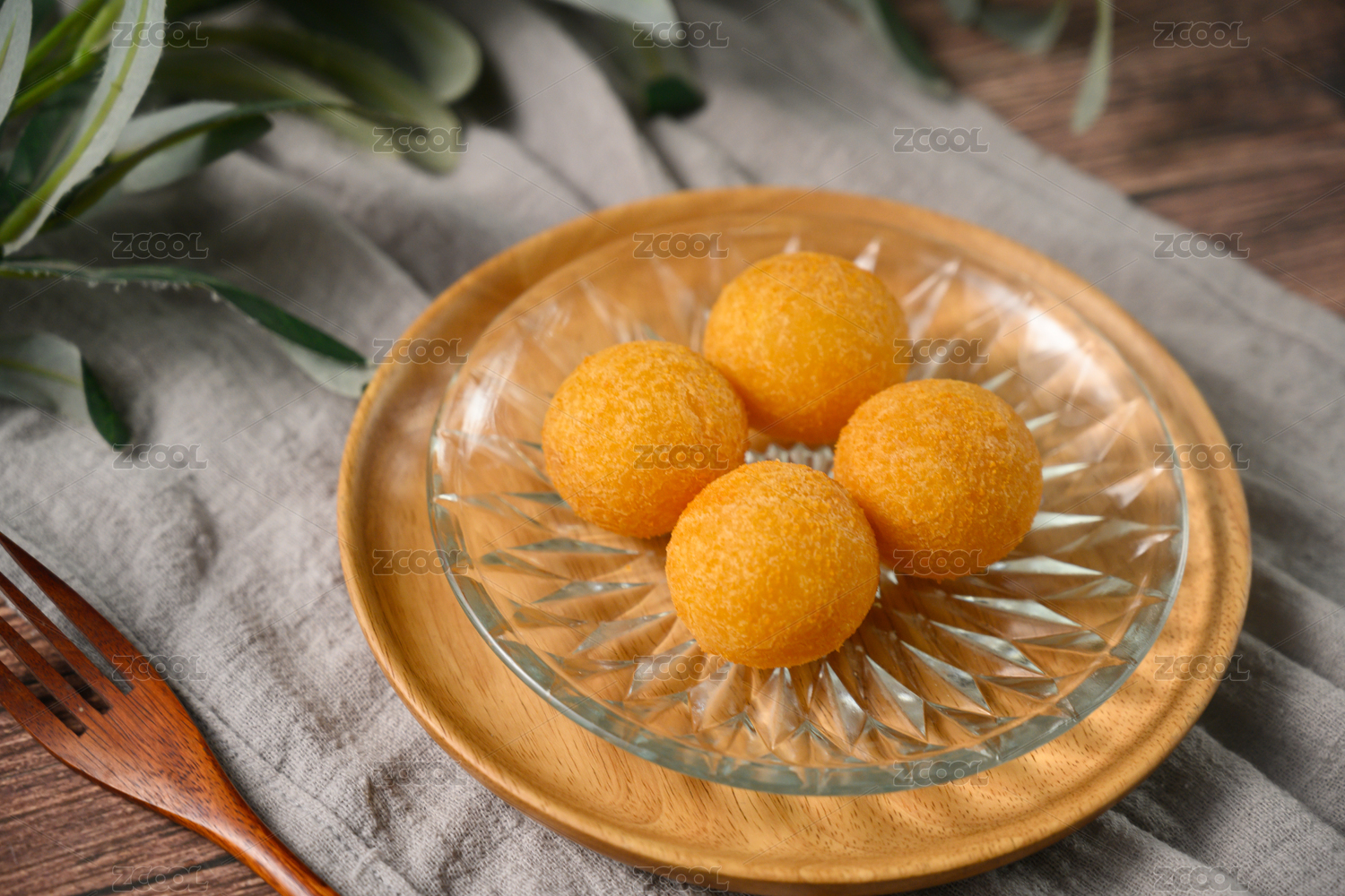 桌面上的盘子里的美味可口的地瓜芝士丸