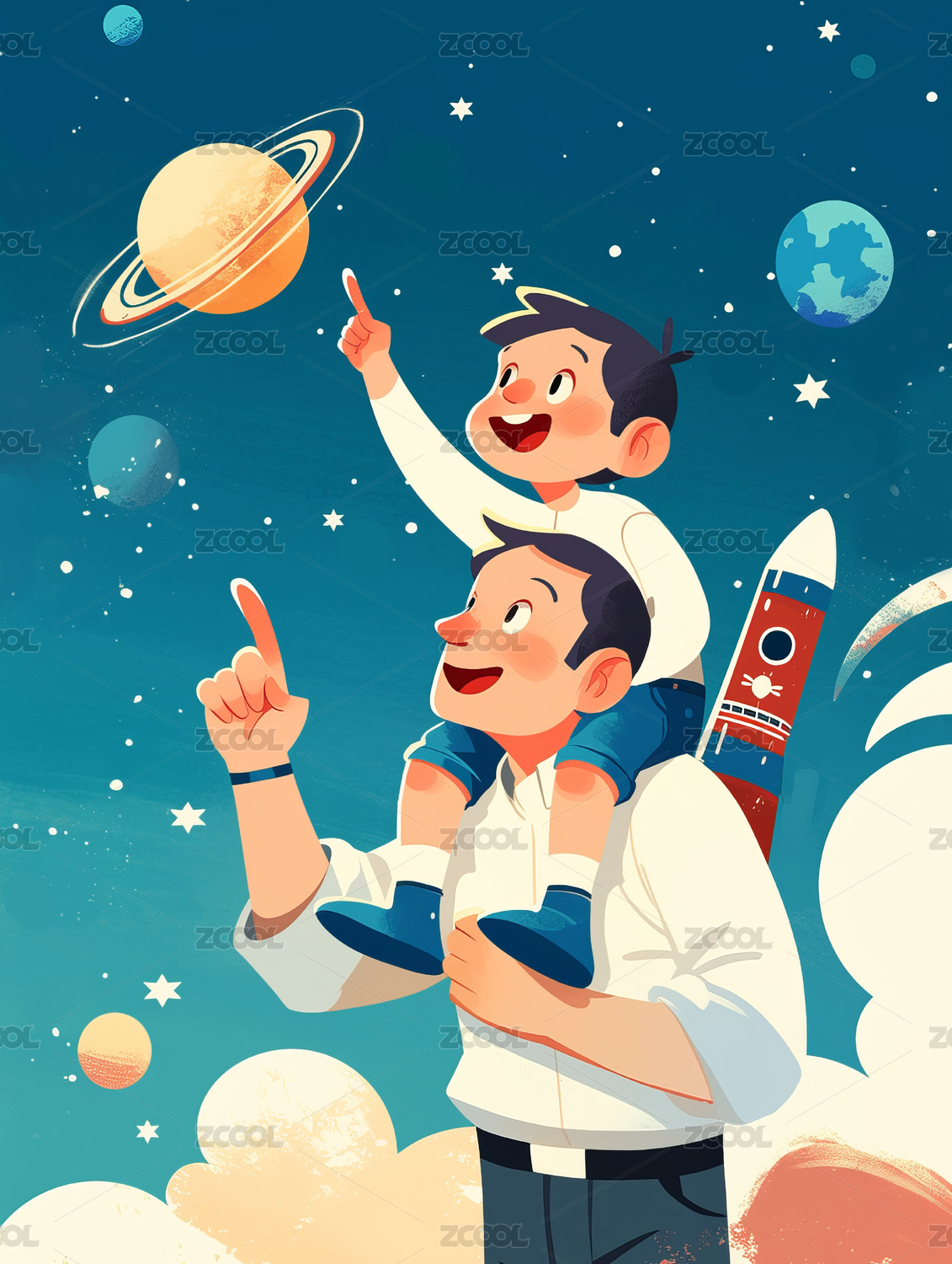 一个孩子坐在爸爸肩上指着太空插画