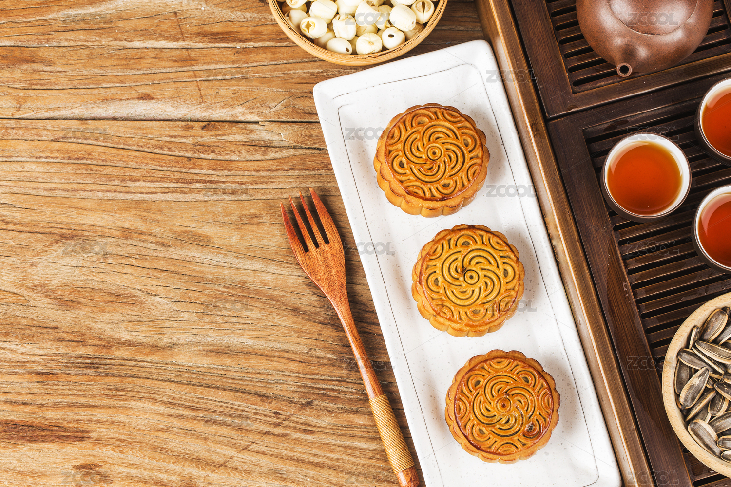 放在木桌上的月饼和茶壶