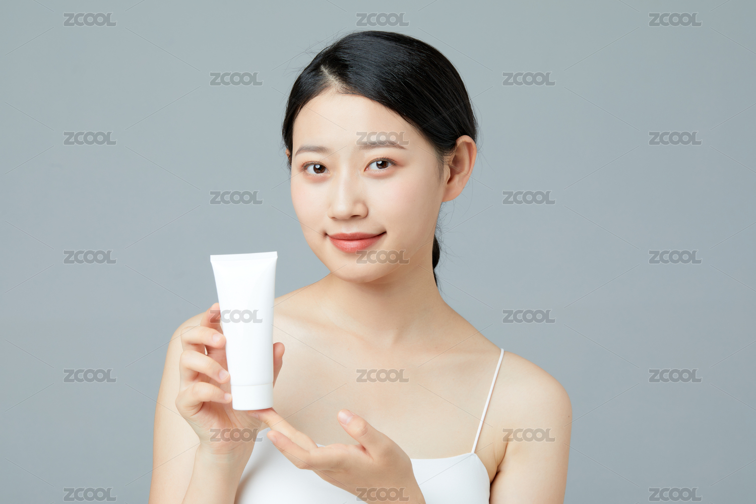 白色背景前展示产品的东方美女