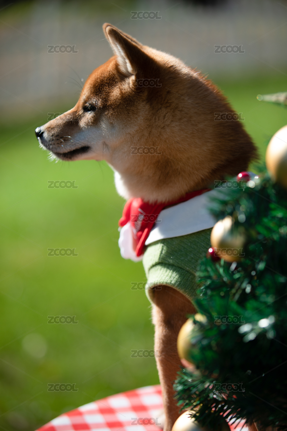 坐在桌上的柴犬和圣诞树