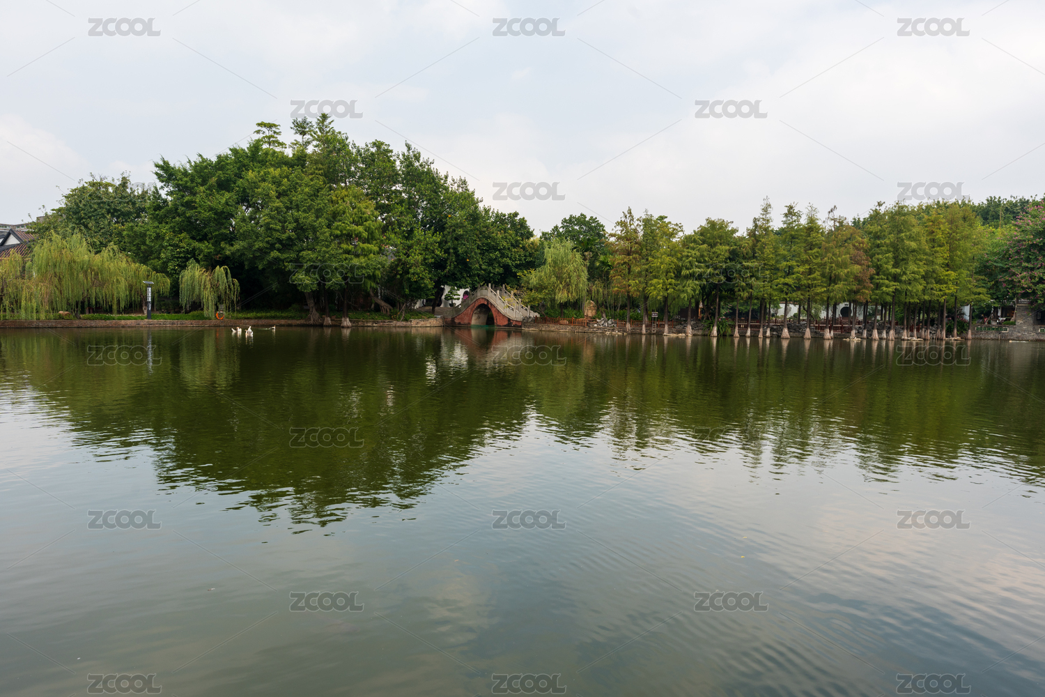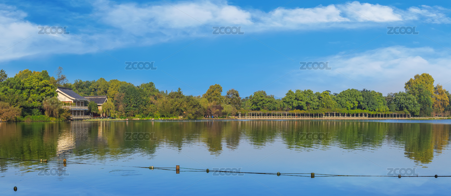 中国云南昆明大观公园蓝天白云红嘴鸥园林景观