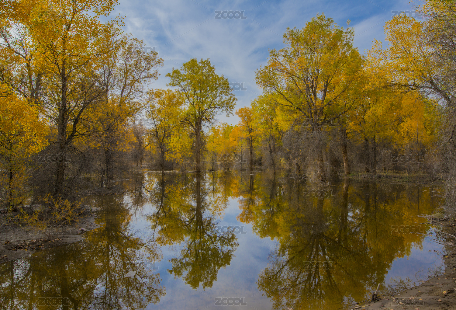 中国酒泉金塔秋天胡杨林水面光影