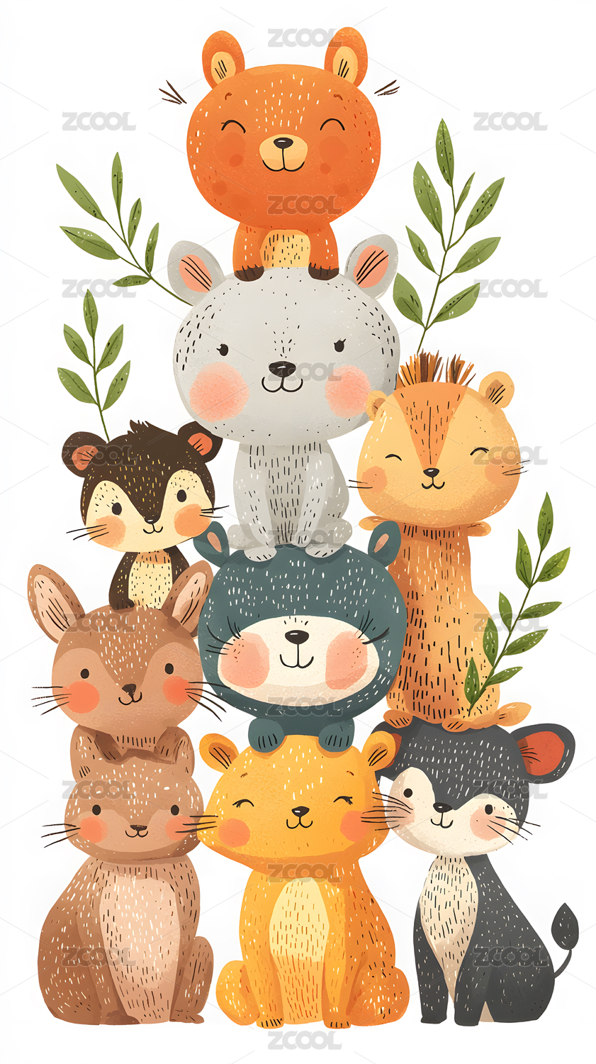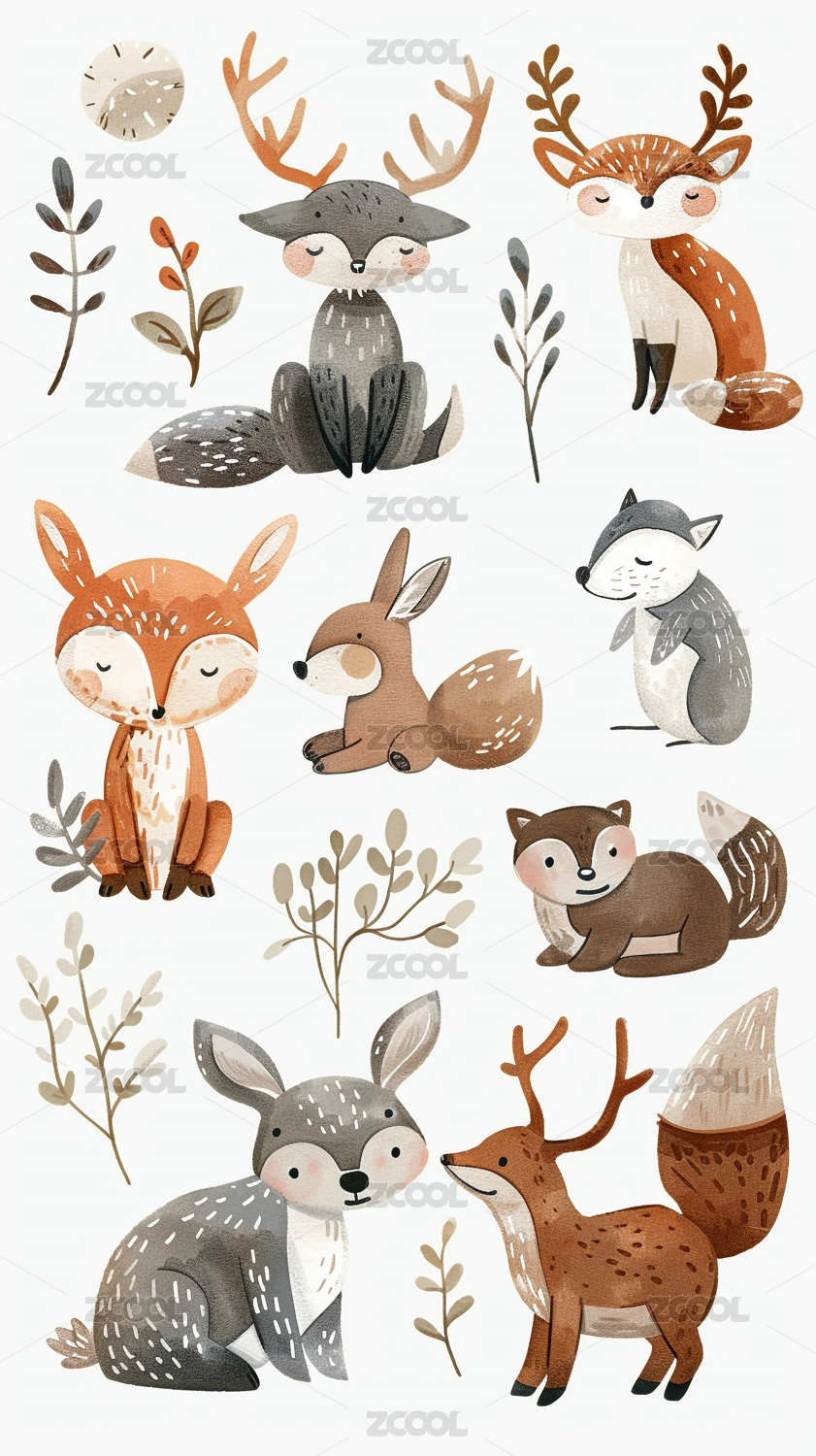 绘本风,动物,狐狸,小鸟,兔子,猫头鹰