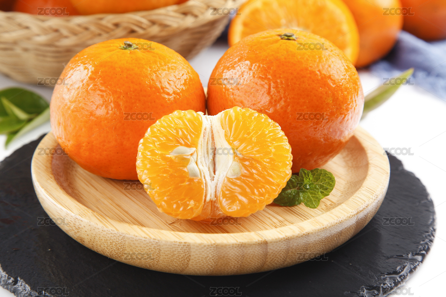 黑石板上盘子里放着贵妃柑和剥皮的橘子果肉