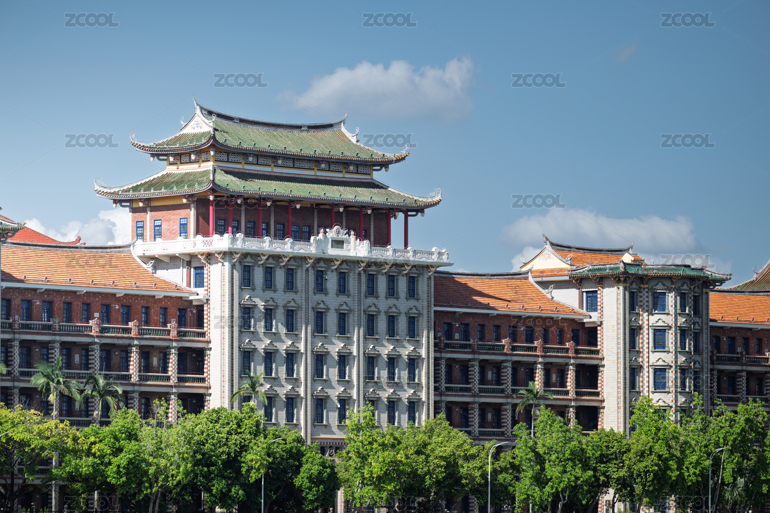 中国福建省厦门大学上弦场及海峡大厦建筑风光
