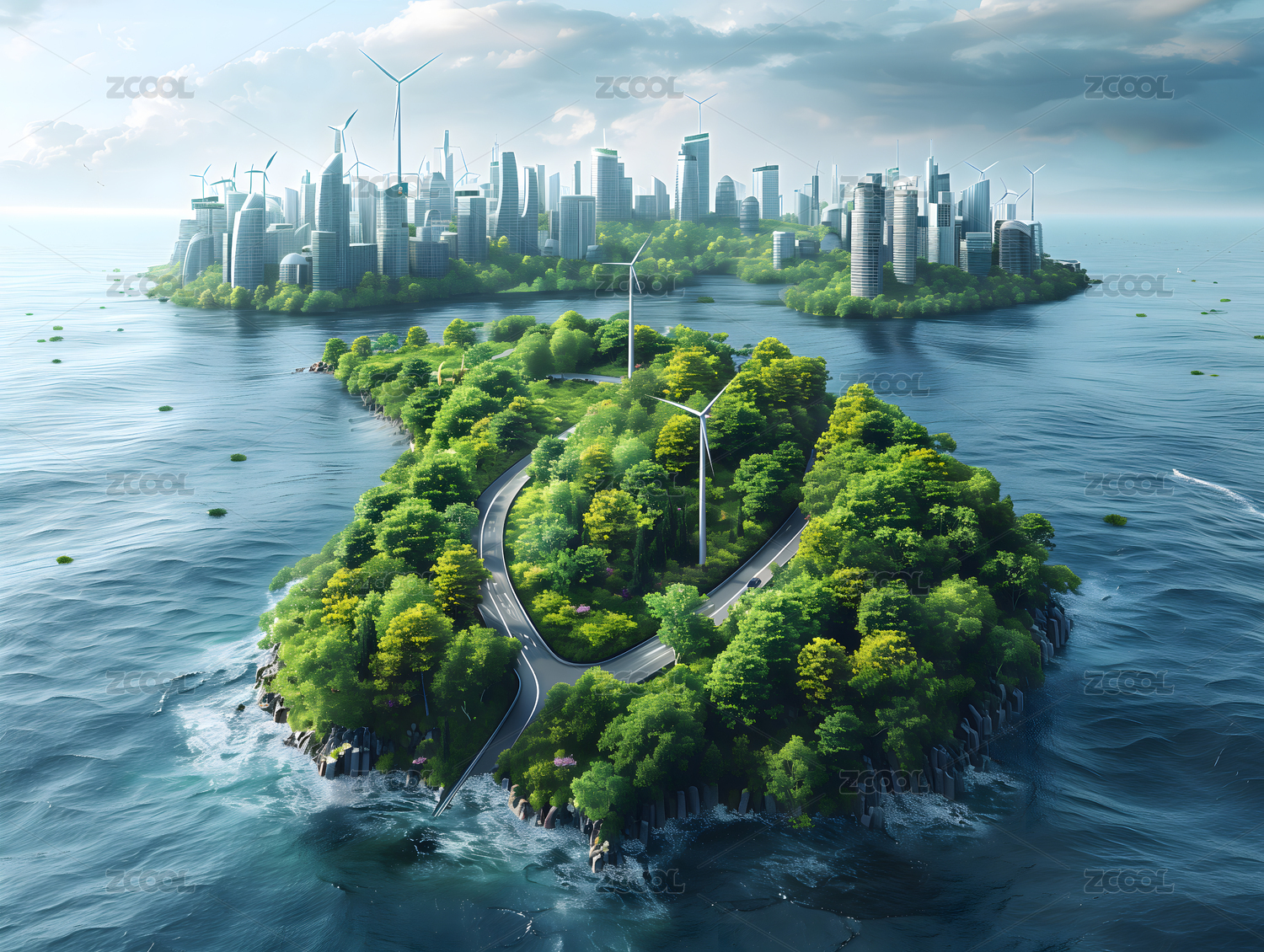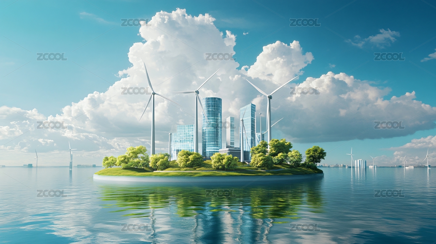 风车,绿色,海洋,大海,建筑,树,绿植,高楼