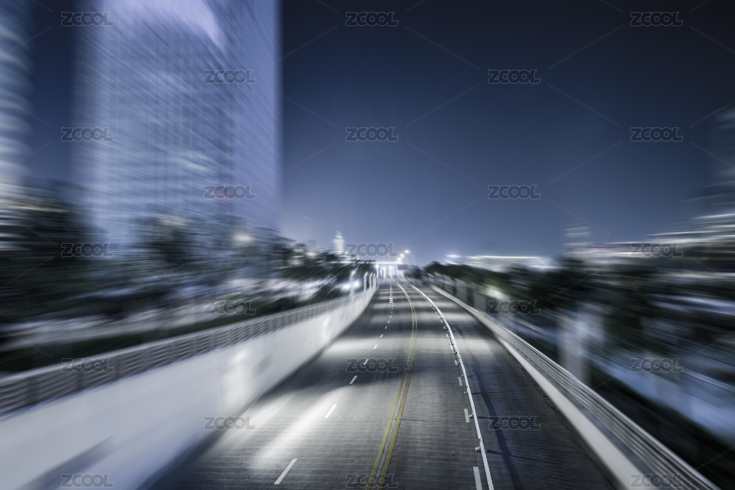 夜间,城市高层建筑边宽阔的运动模糊马路
