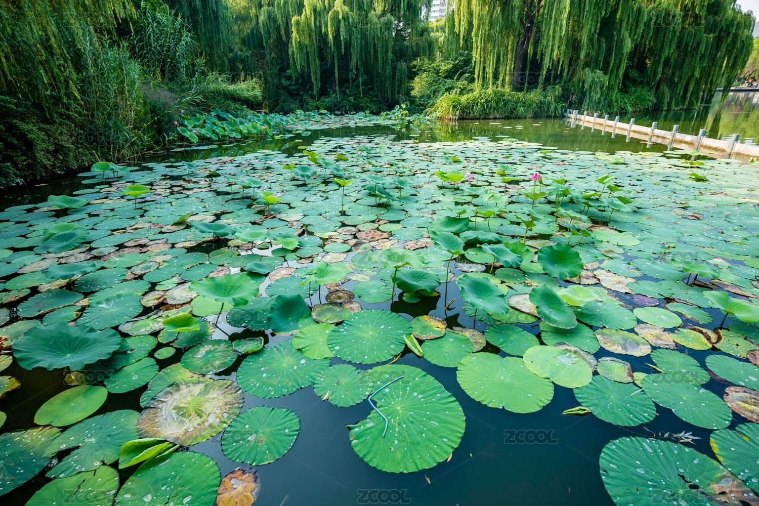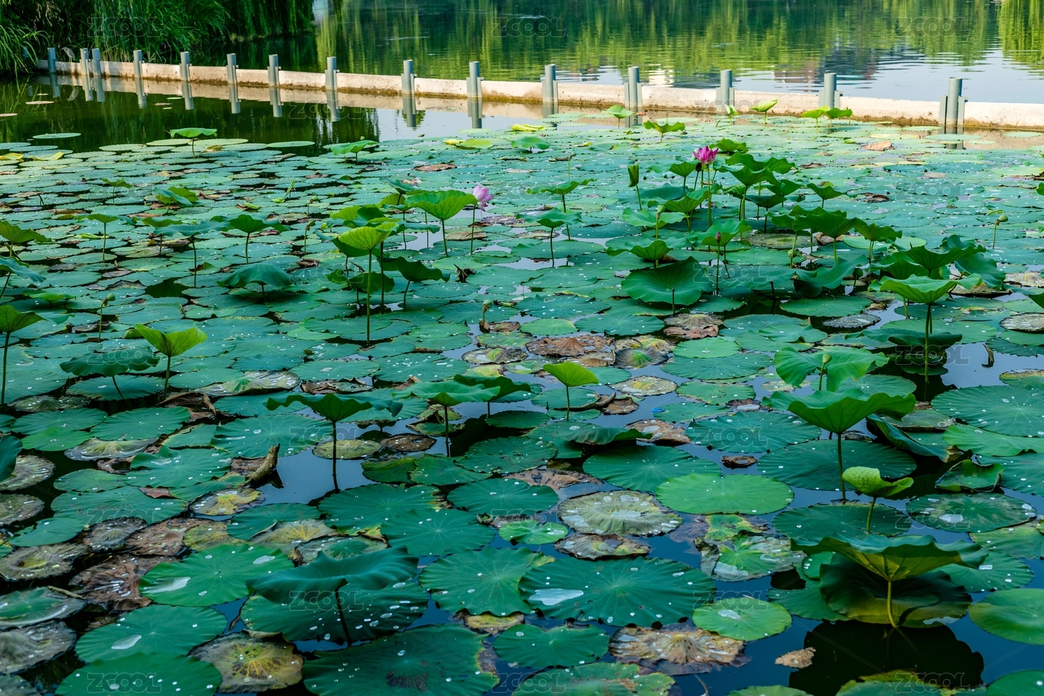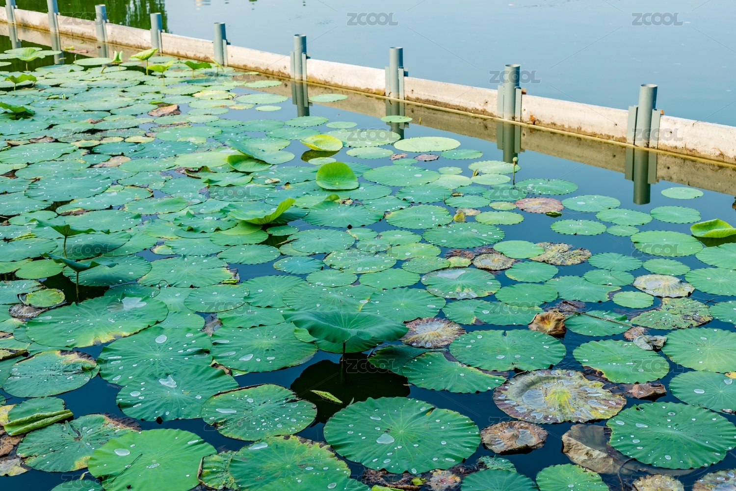阴冷的下雨天, 荷塘里荷叶上沾满了水珠