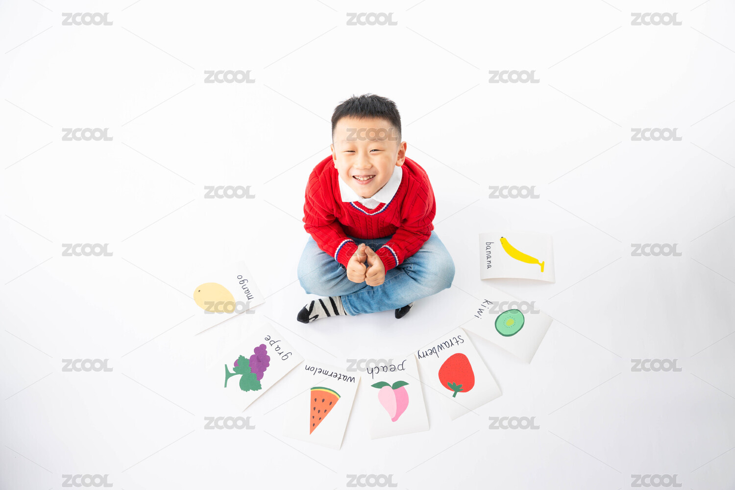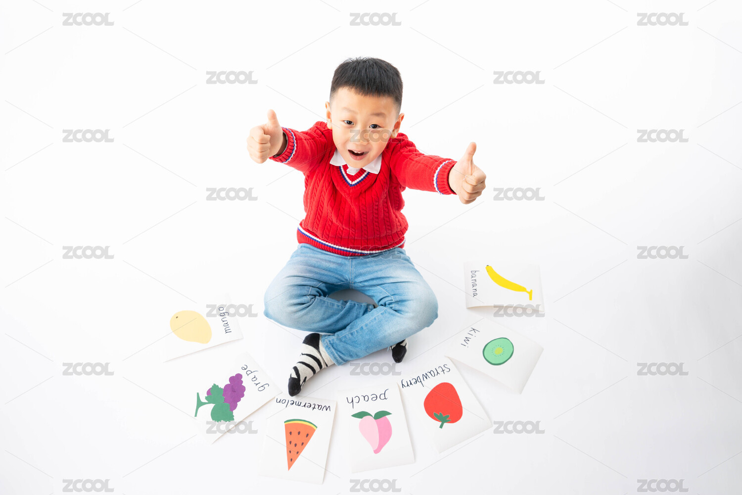 室内白色背景男孩拿着英语卡片跳