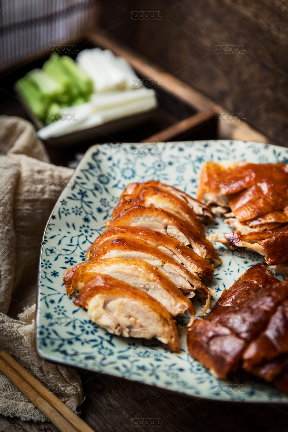 传统美食特色名菜烤鸭摆放在木桌面上特写