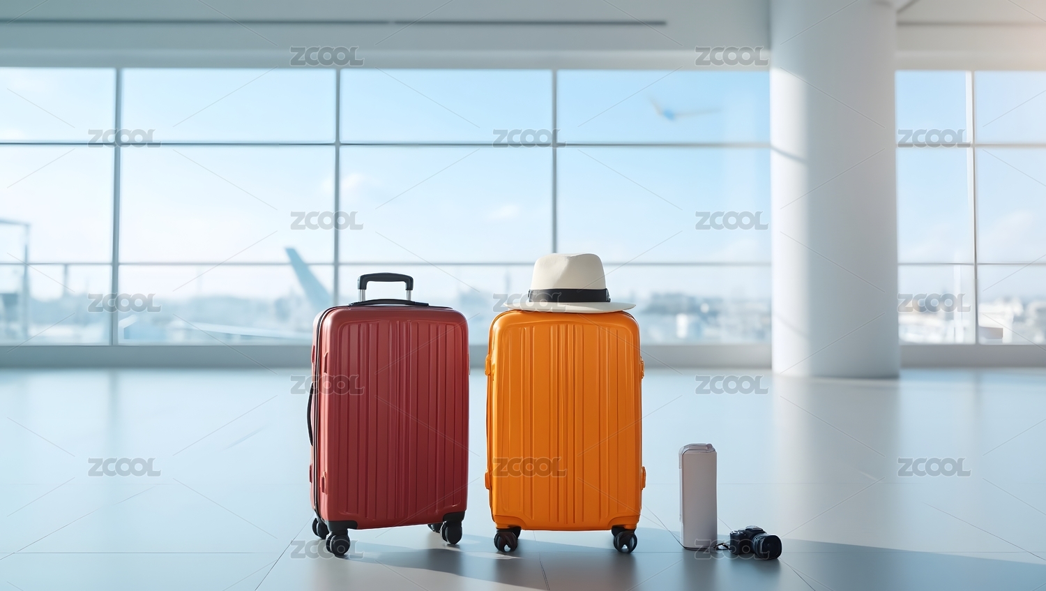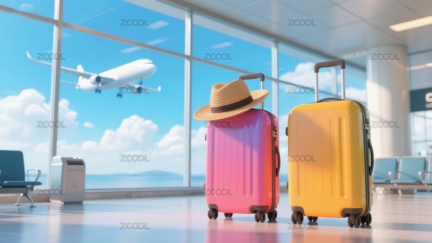 行李箱,飞机场,飞机,阳光,落地窗,明亮,夏天,旅游,出行,草帽