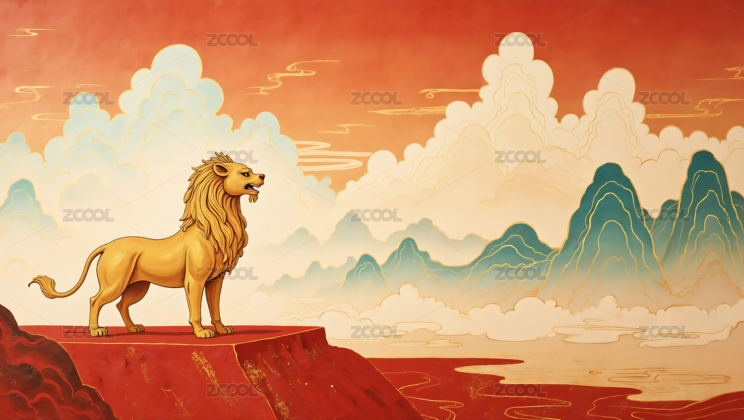 国潮,插画,动物,中国风,AIGCFG,写意,狮子
