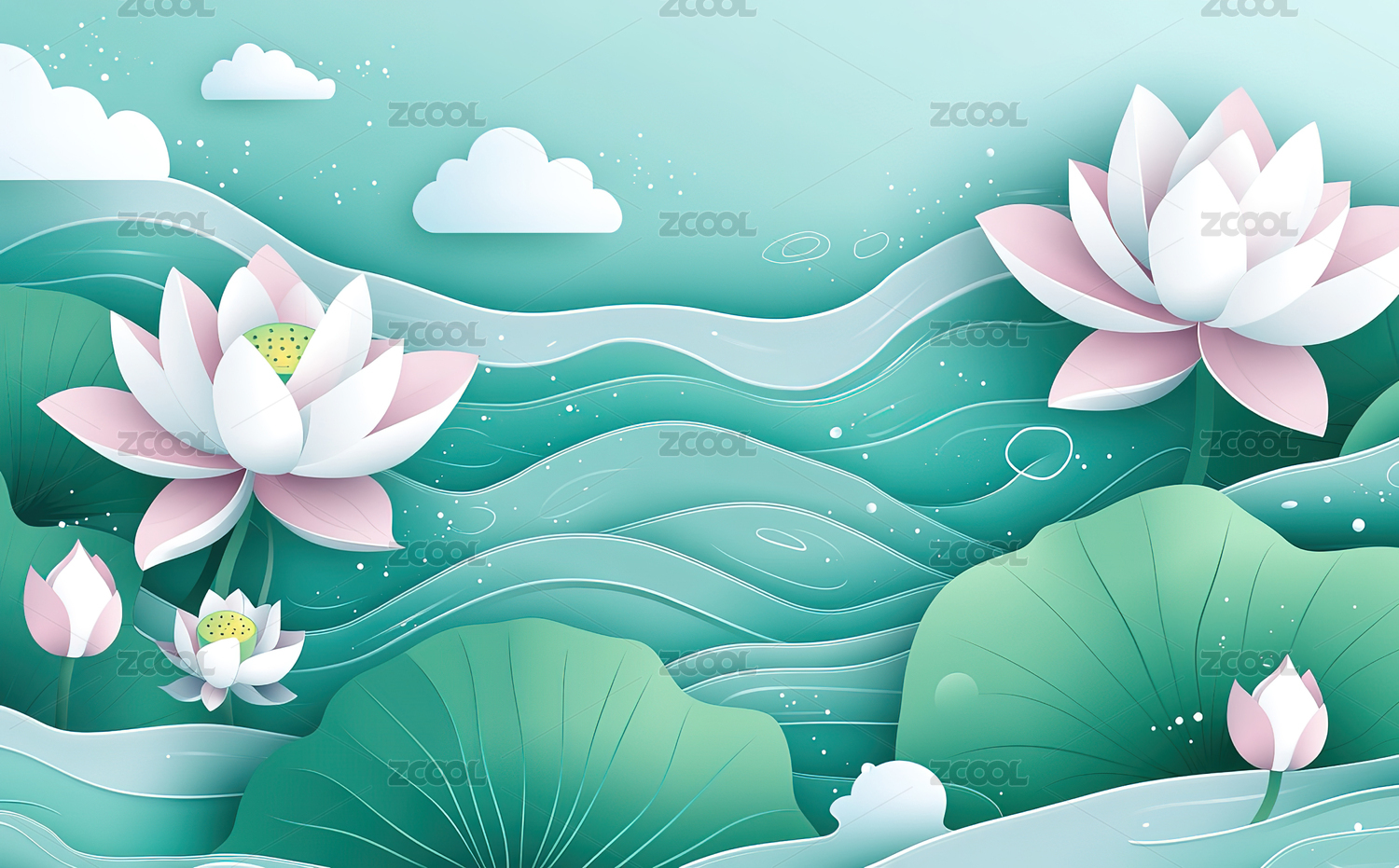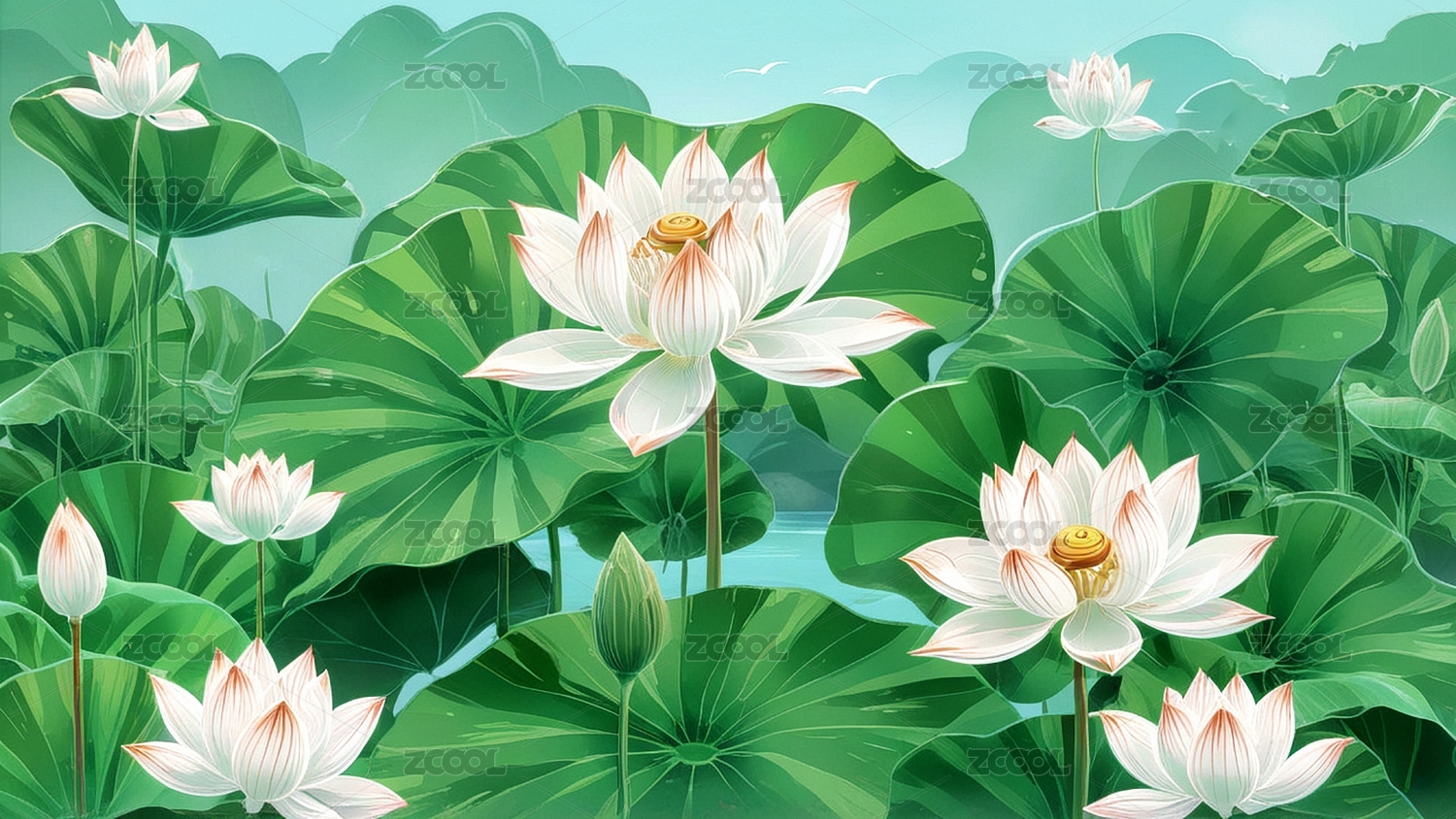 荷花塘风景插画国风海报立夏节气荷花池插图