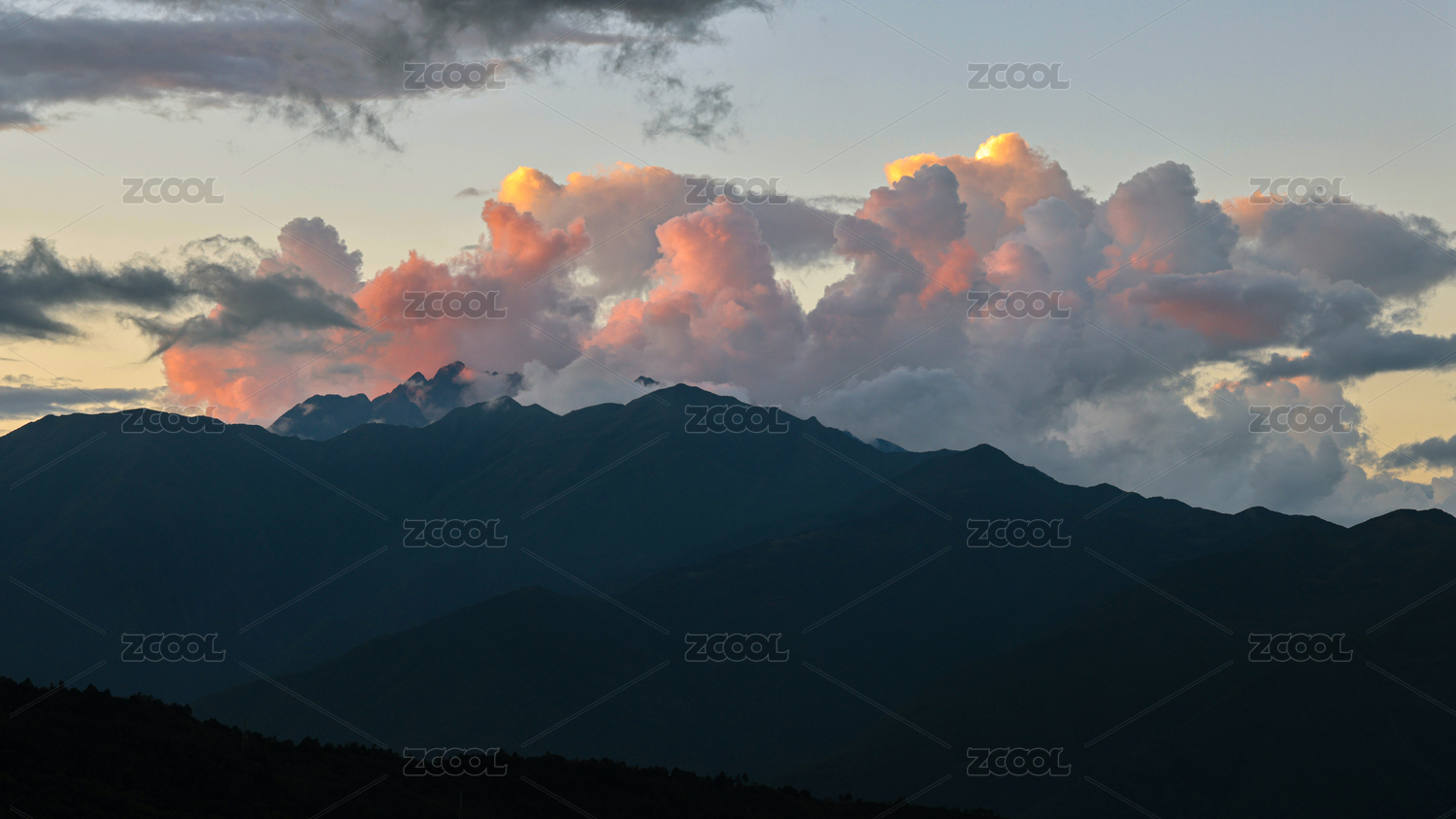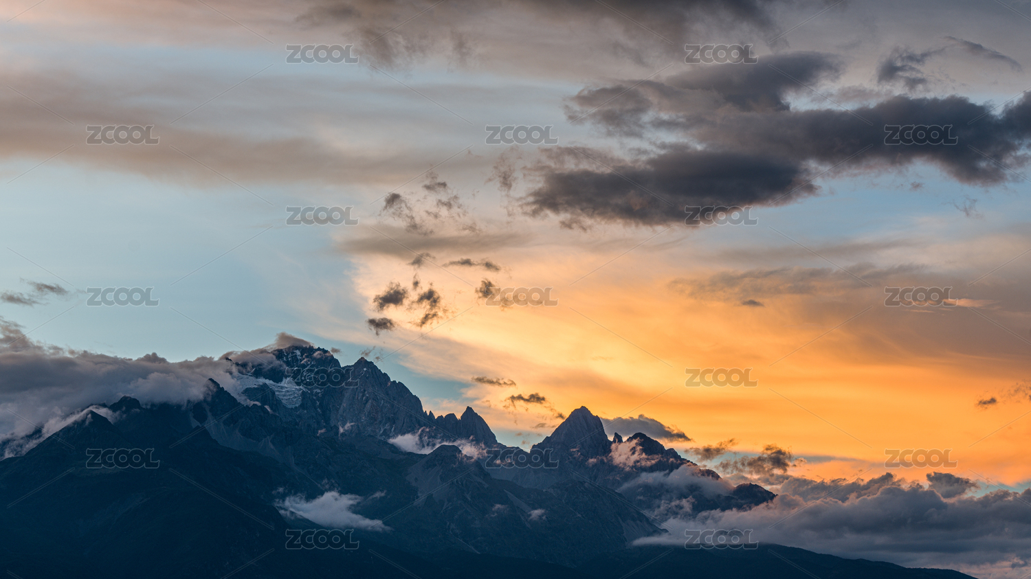 傍晚拍摄云雾中的云南丽江玉龙雪山