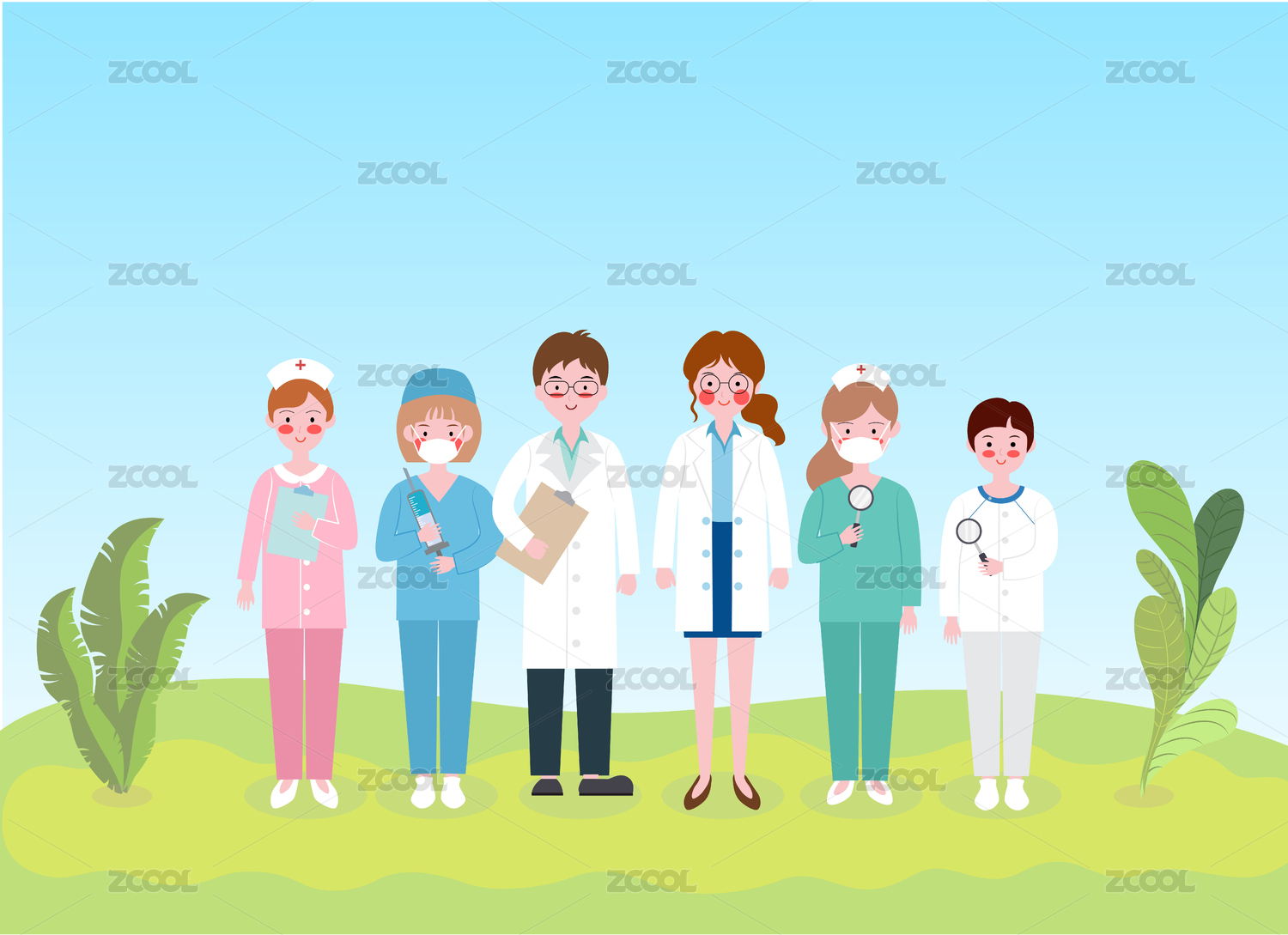 6个扁平风医务人员在绿色的草坪上站排合影