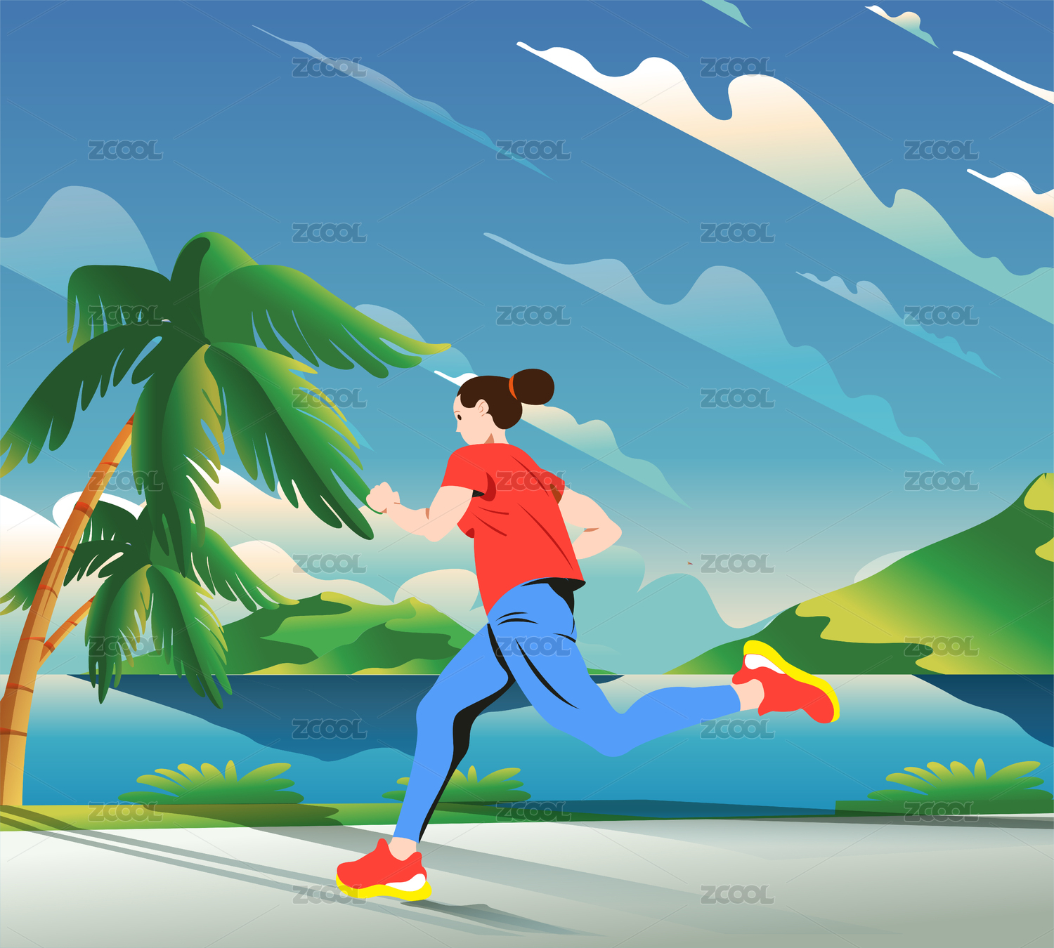 春天夏天年轻女性湖边晨练跑步插画