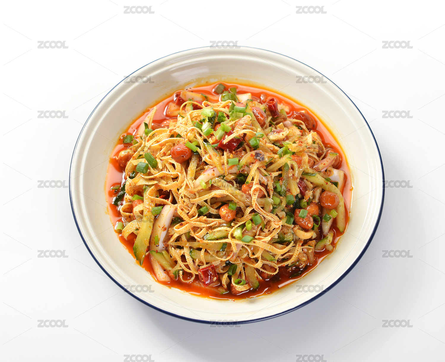 木桌上的一碗拌好的四川凉菜红油耳丝特写