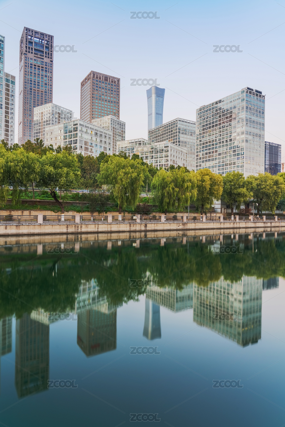 中国北京现代城市建筑与清澈的河流水面倒影