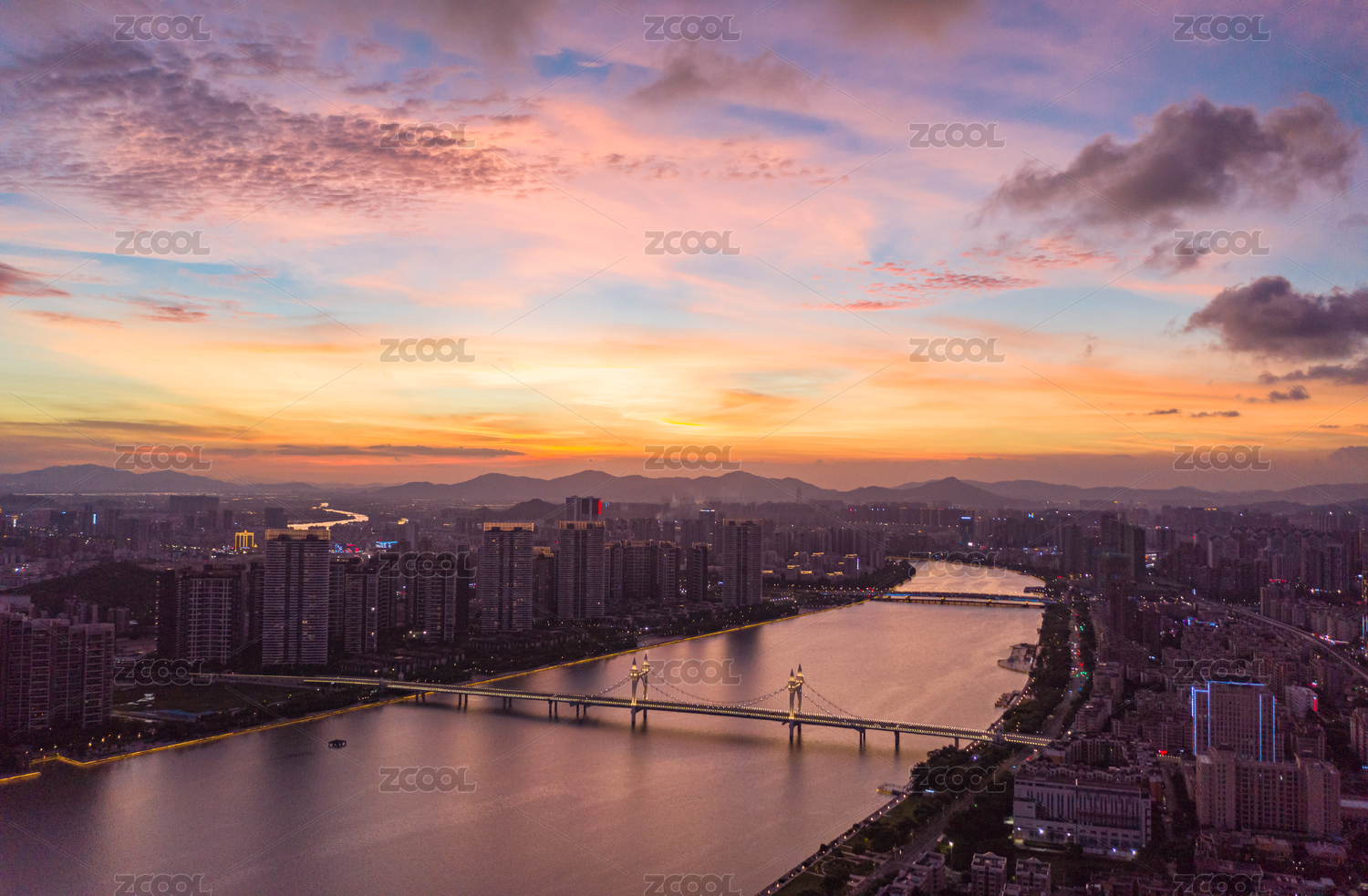 中国广东省珠海市白石桥城市风光晚霞航拍