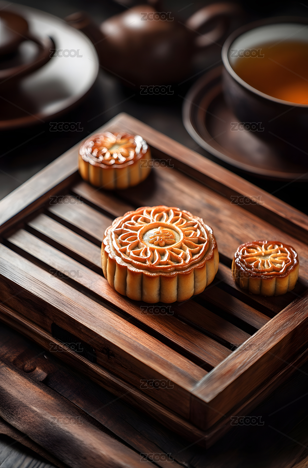 木纹桌面上摆放的月饼、茶壶茶杯和几粒散落的石榴籽